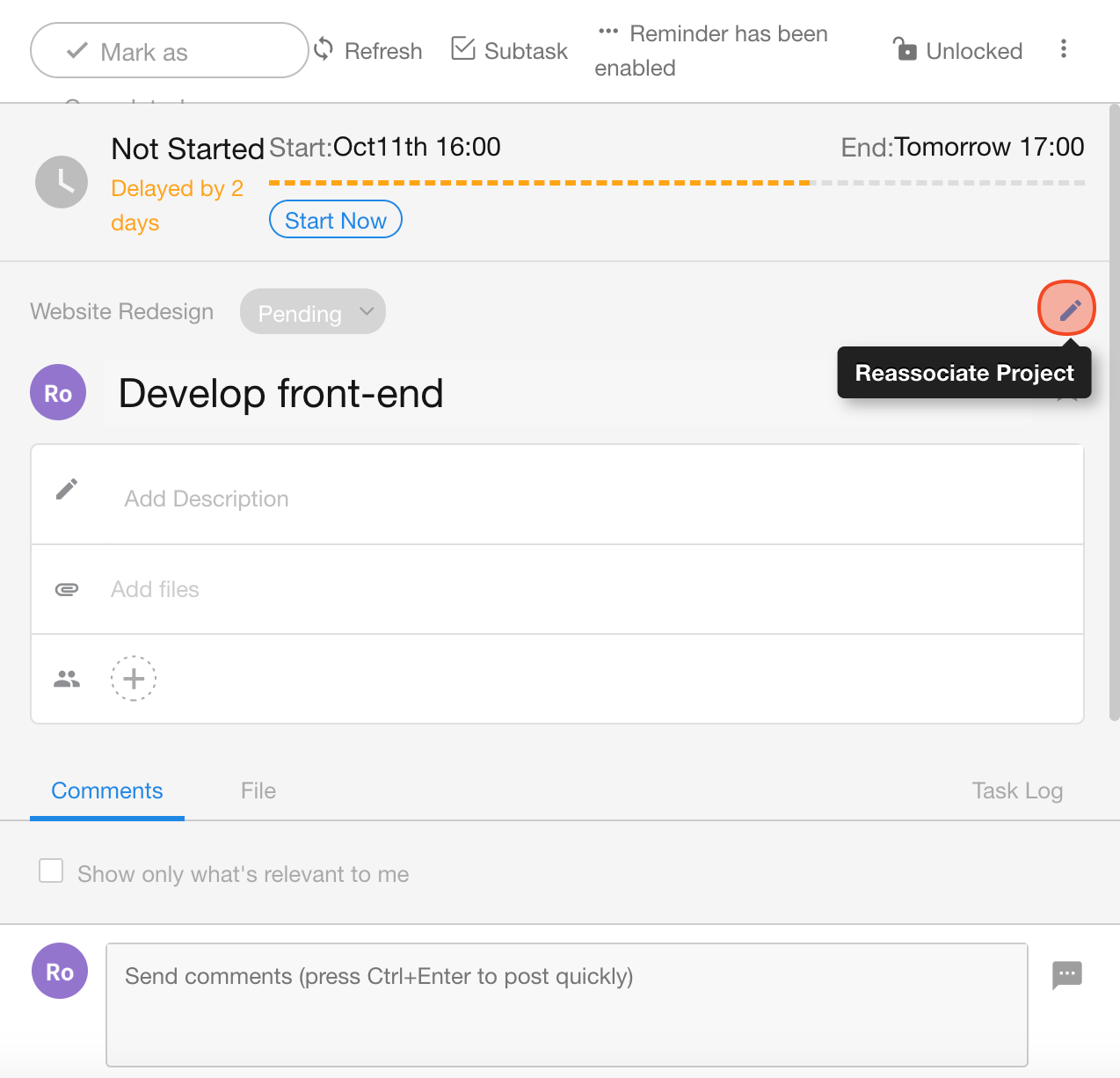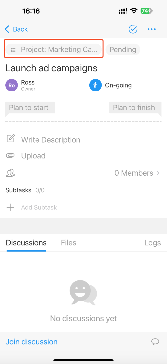 - If the task is not linked to any project or parent task, the red box will display its associated organization or collaboration.