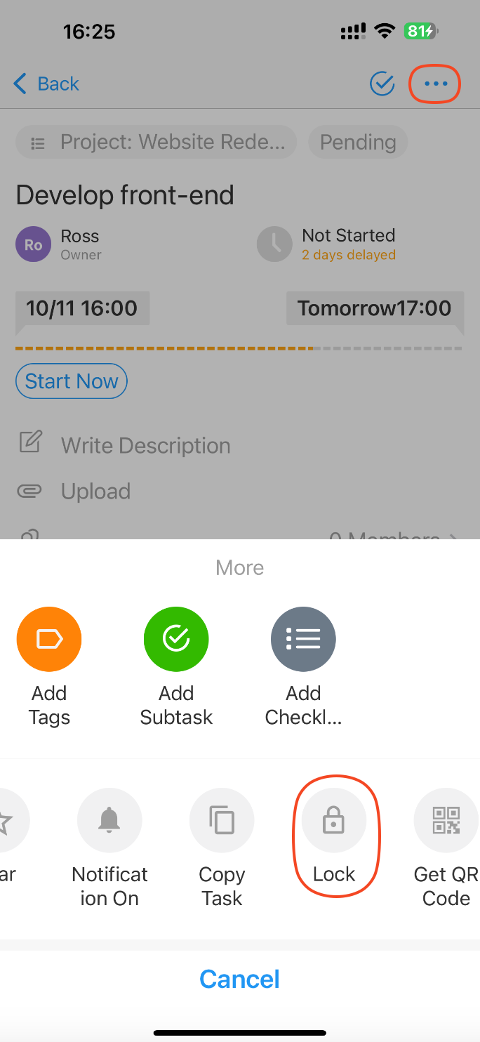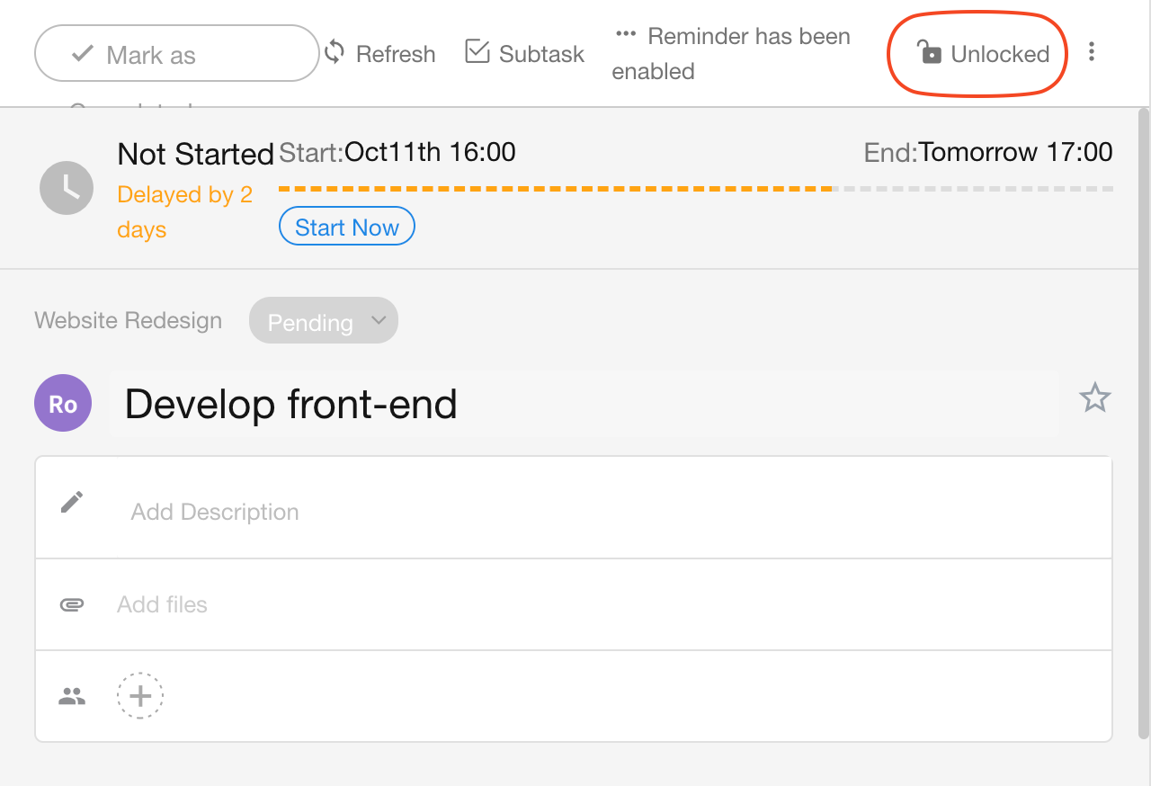 Open the task details page and click the Lock icon. Once locked, members will no longer be able to modify the task.