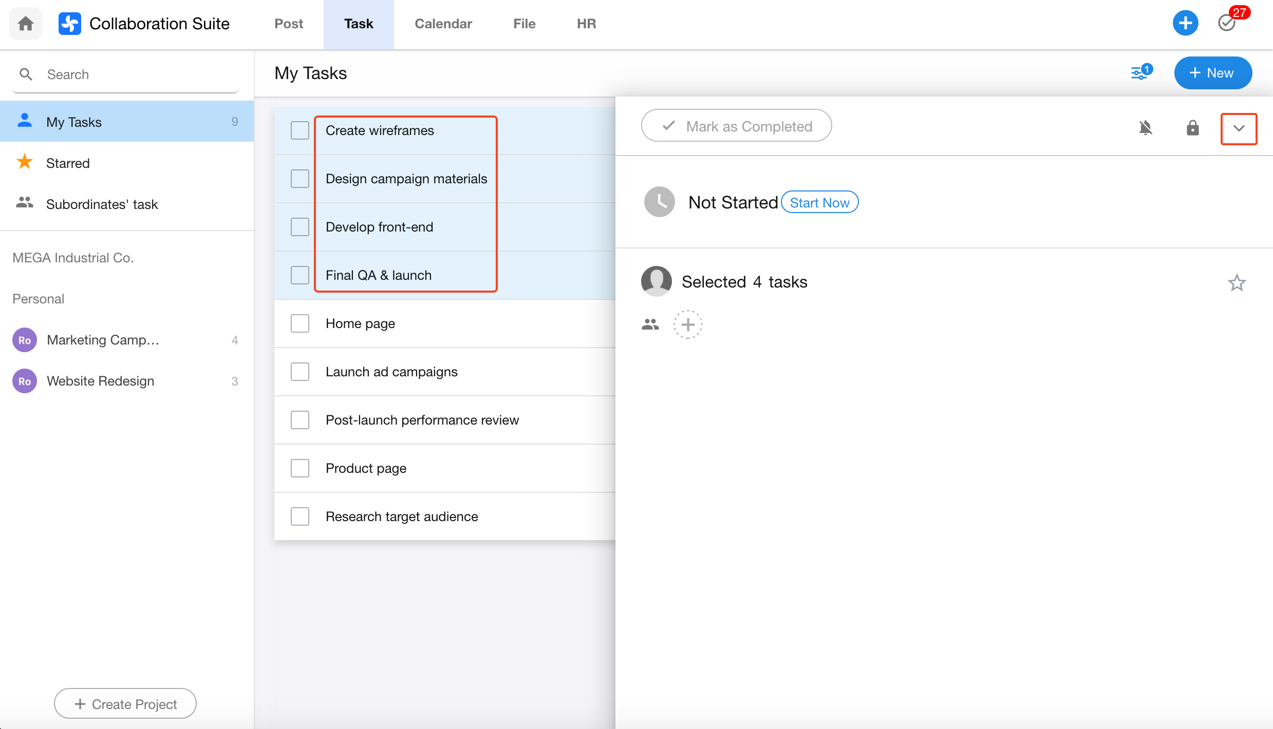 Hold the Ctrl key (Command on macOS) and click on multiple tasks. An action panel will appear on the right.