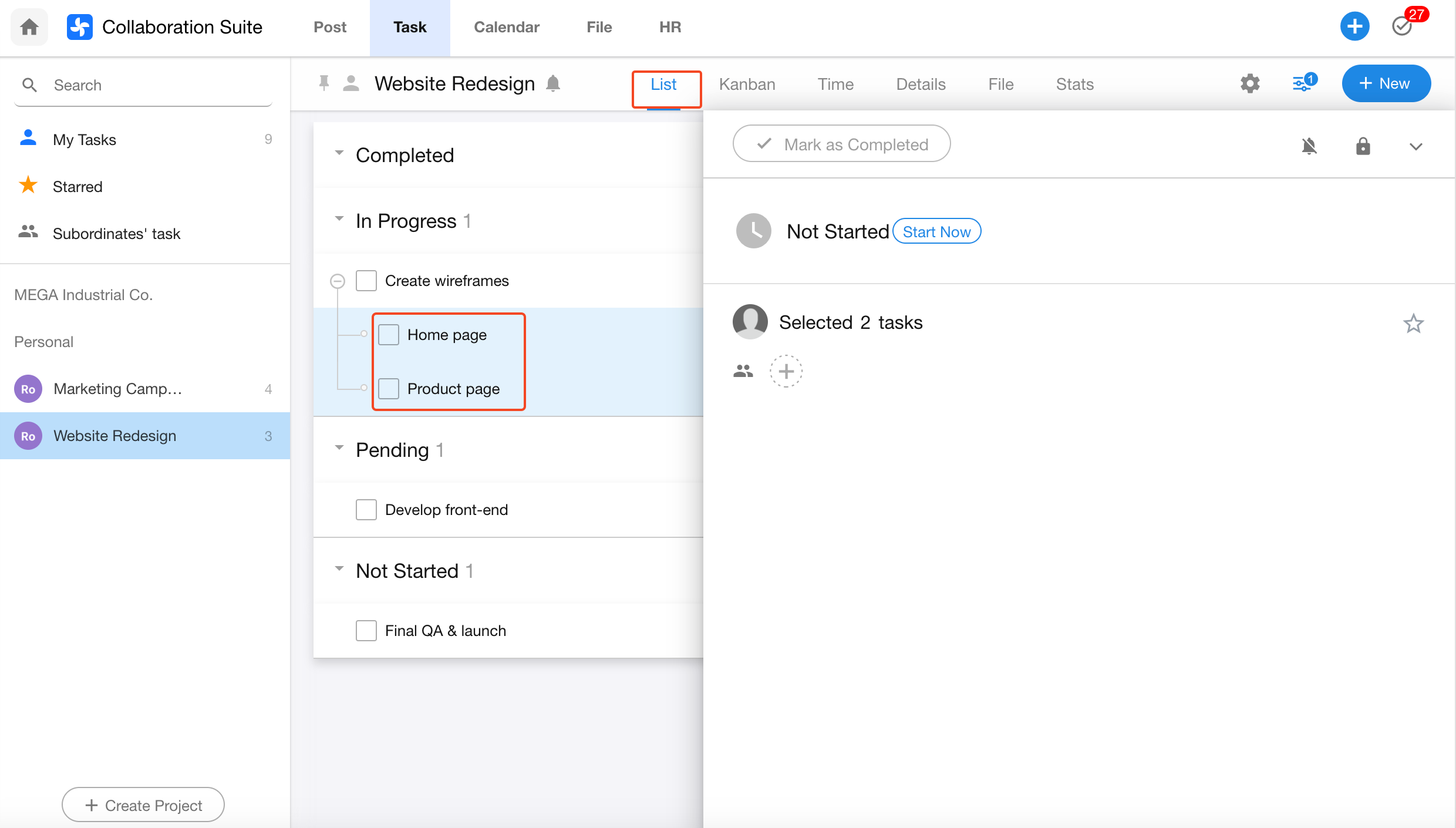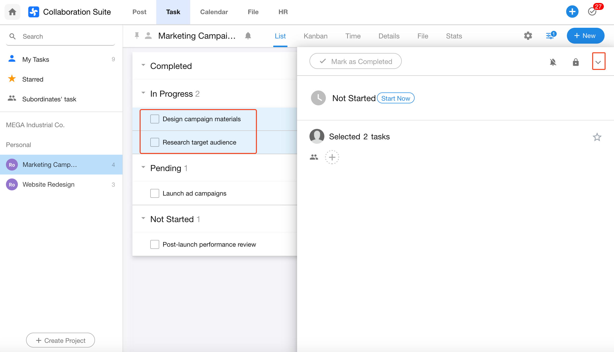 If the tasks belong to a project and include subtasks, we recommend performing bulk operations from the [Project] > [List View] section to ensure the parent-subtask structure is visible.