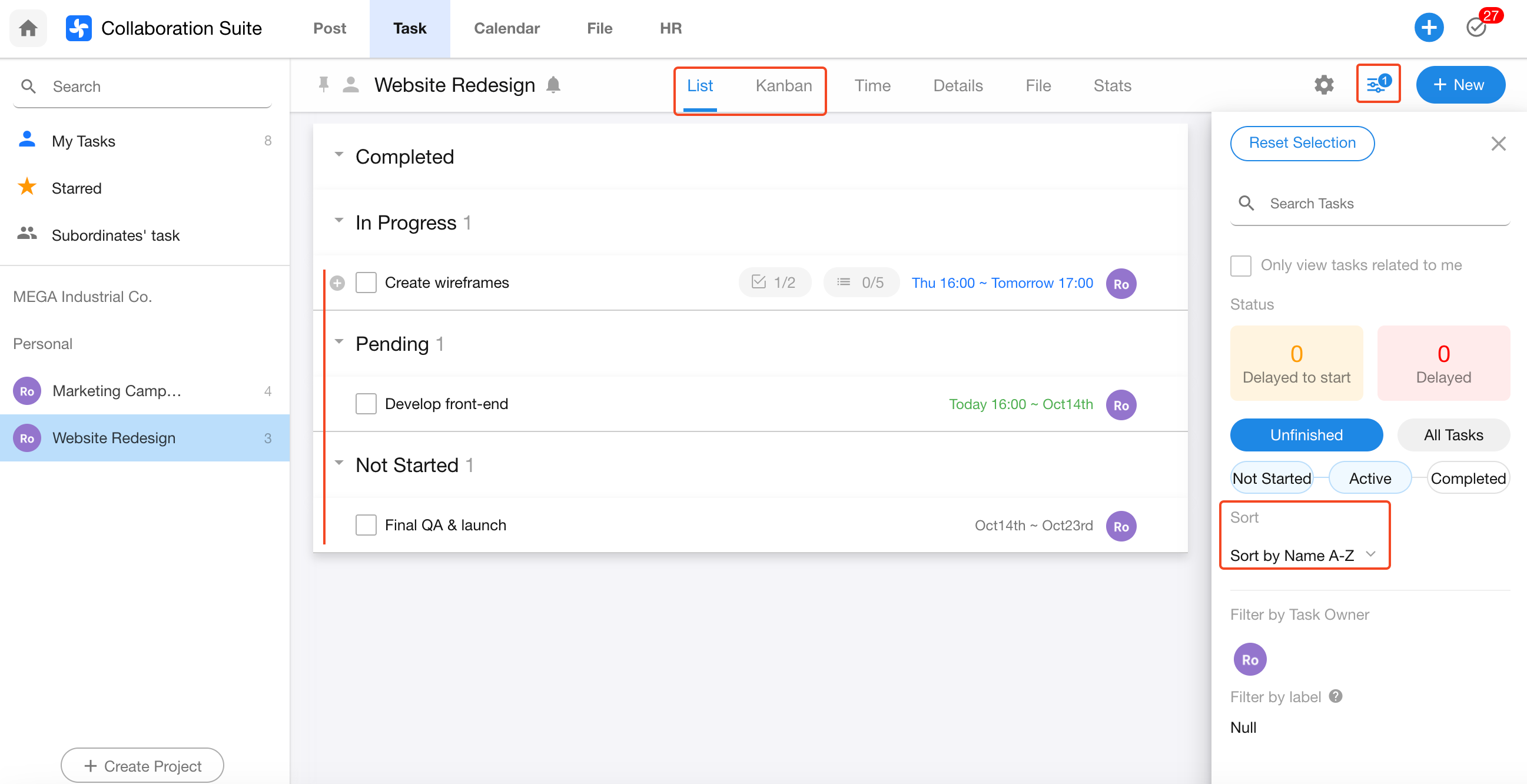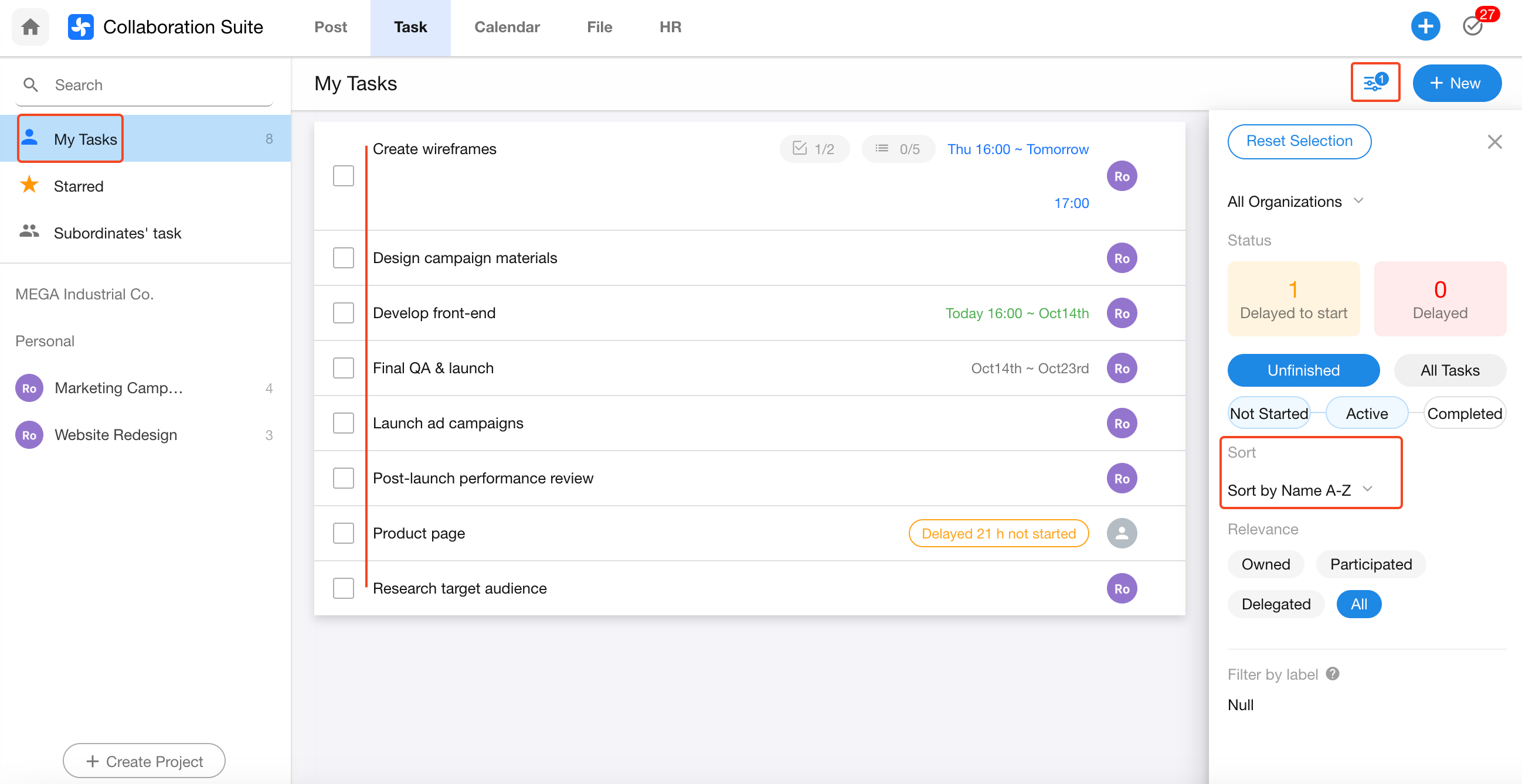 Sorting Tasks in "My Tasks" List