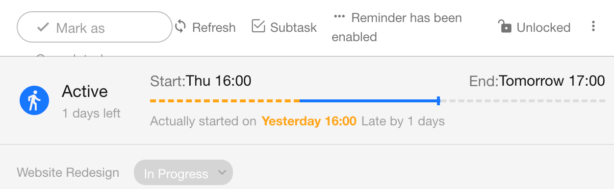 - Planned start date is set, actual start date is empty, and the planned start date is before today: Not Started (Overdue Start)