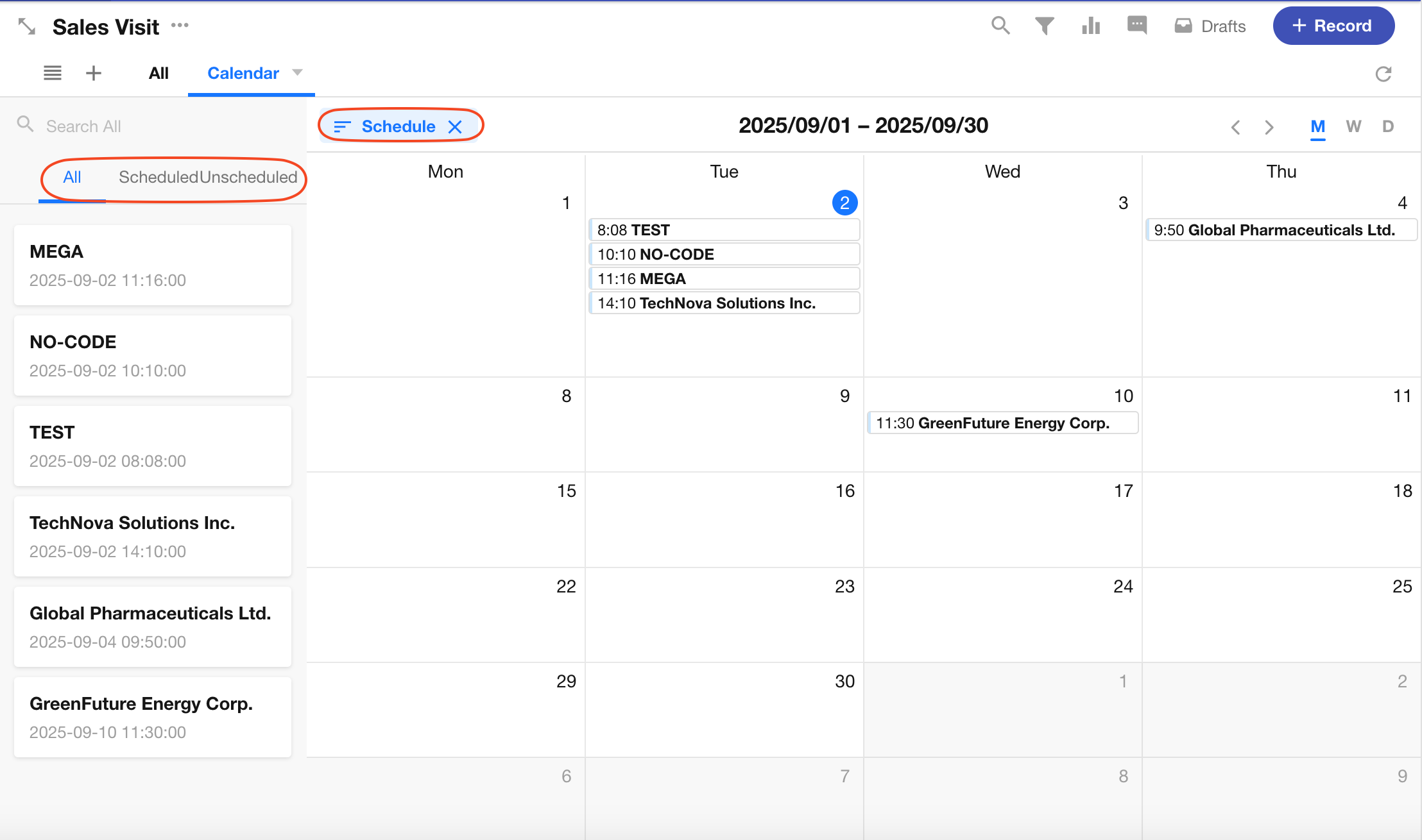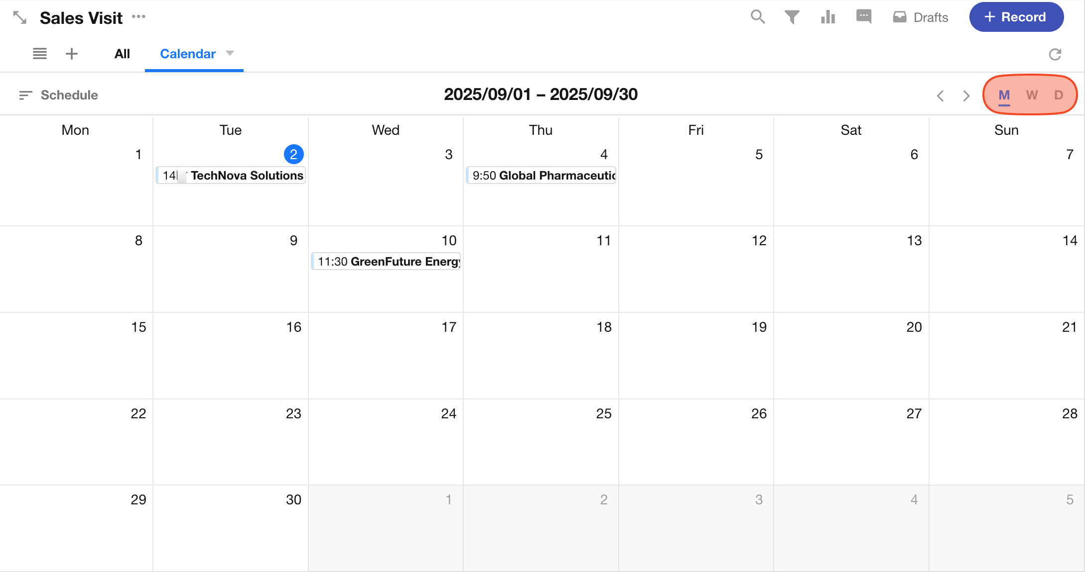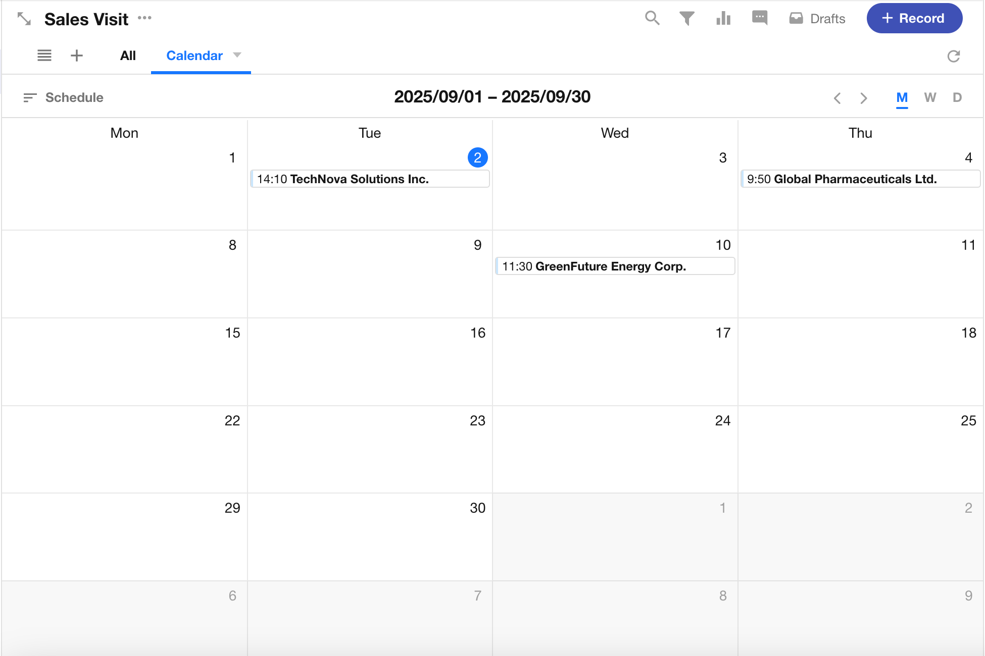 The calendar view helps users manage date-related record data more efficiently. For example, in sales visits or production schedules, you need to know: