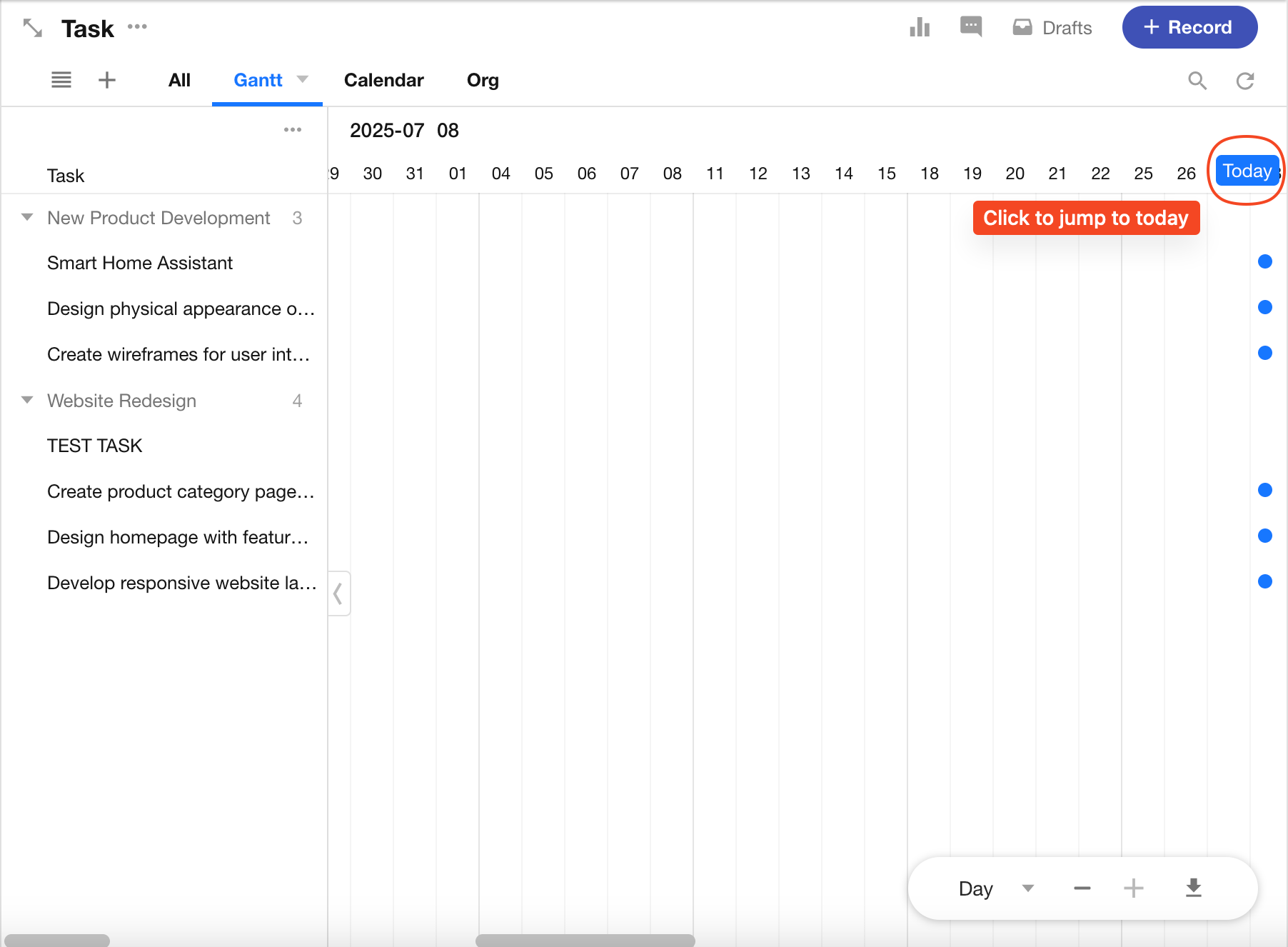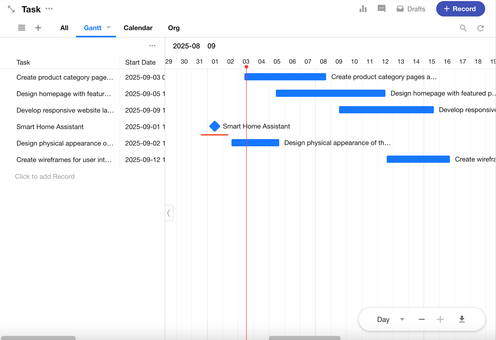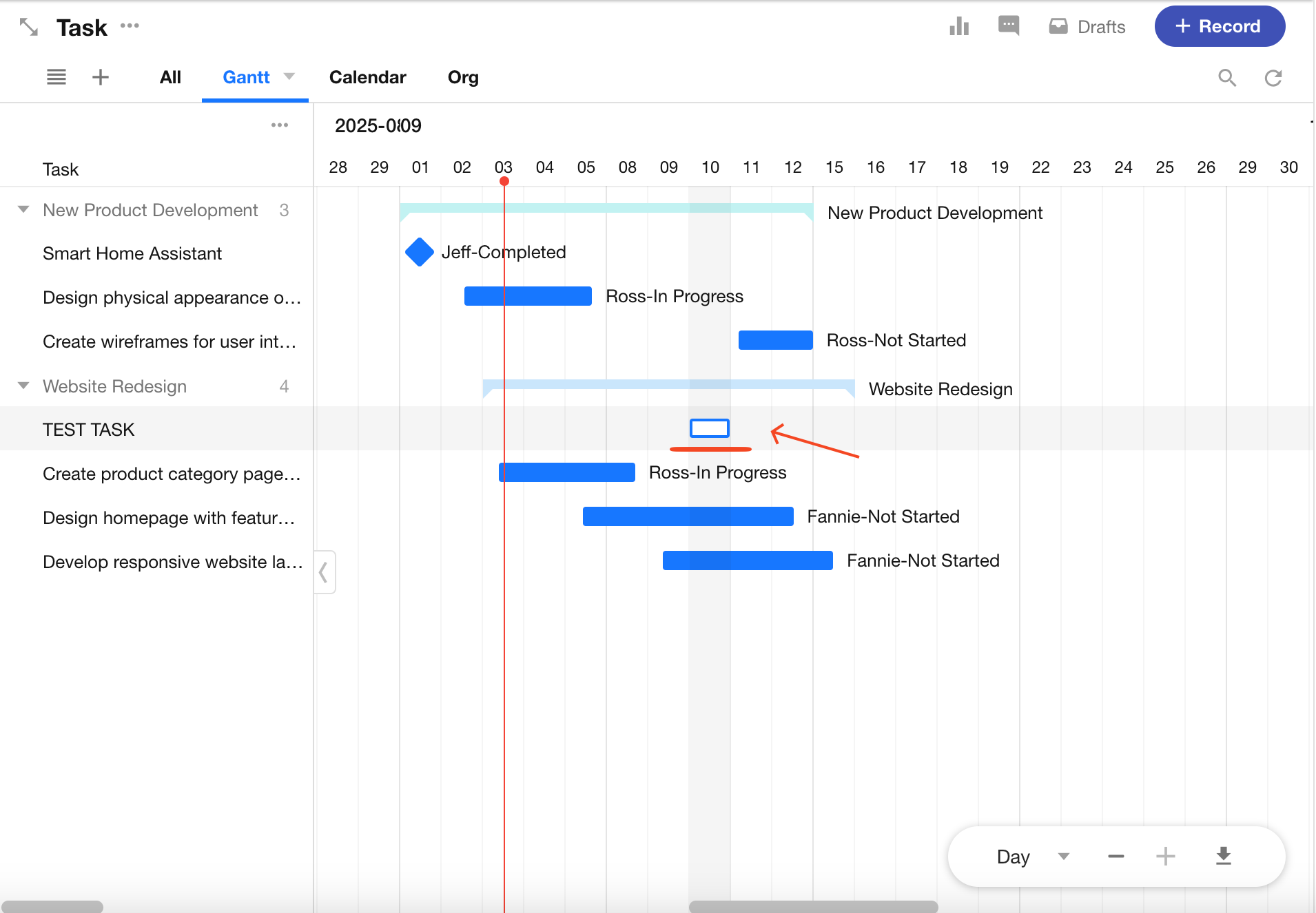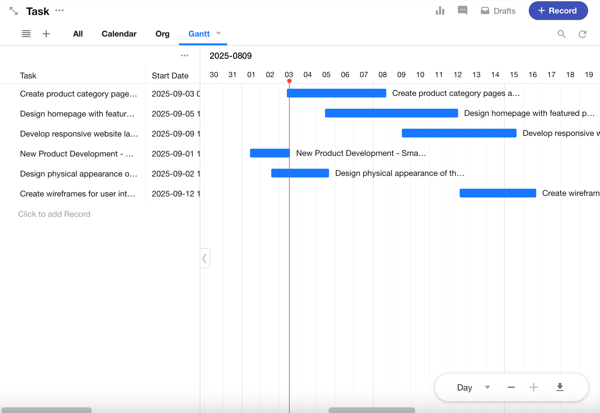 In a Gantt view, the horizontal axis represents time, while the vertical axis lists data records (tasks or activities). Each record is displayed as a horizontal bar, where the position and length indicate the start/end date, duration, and sequential relationship between tasks.