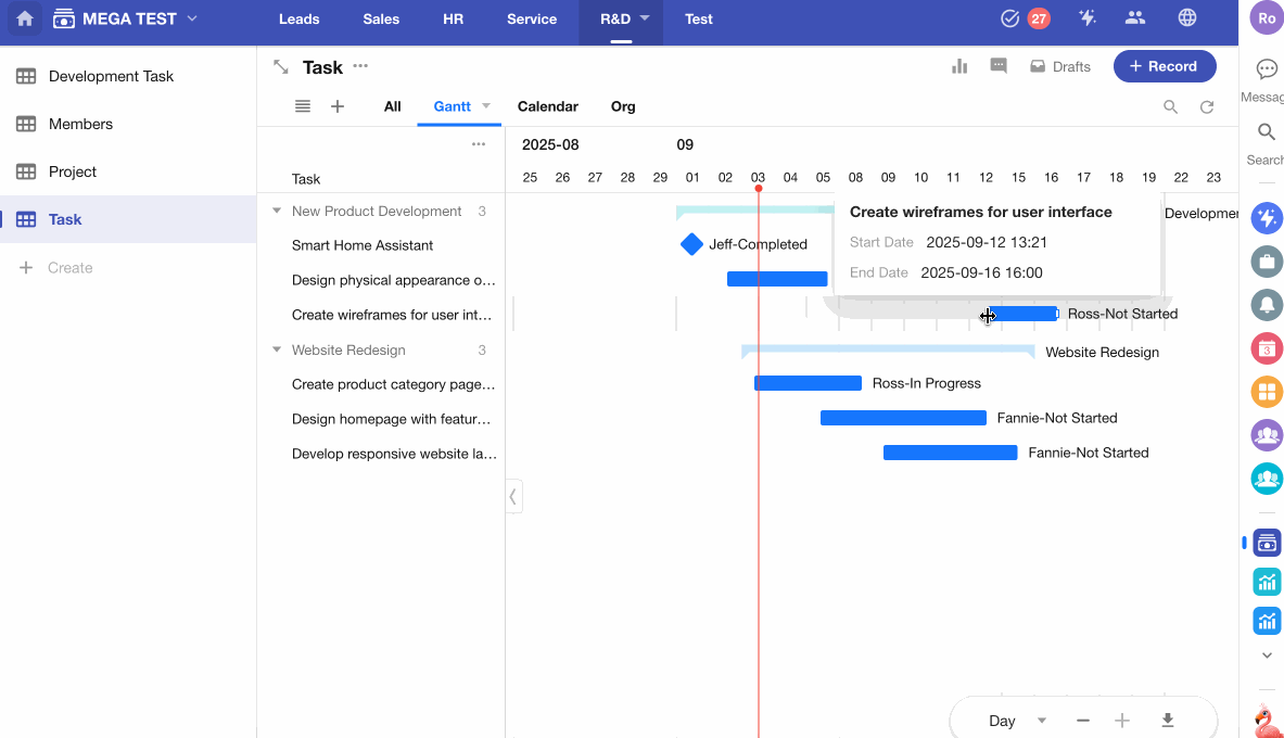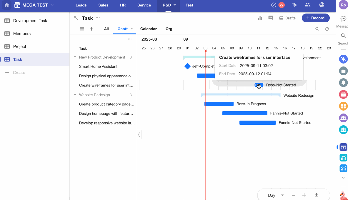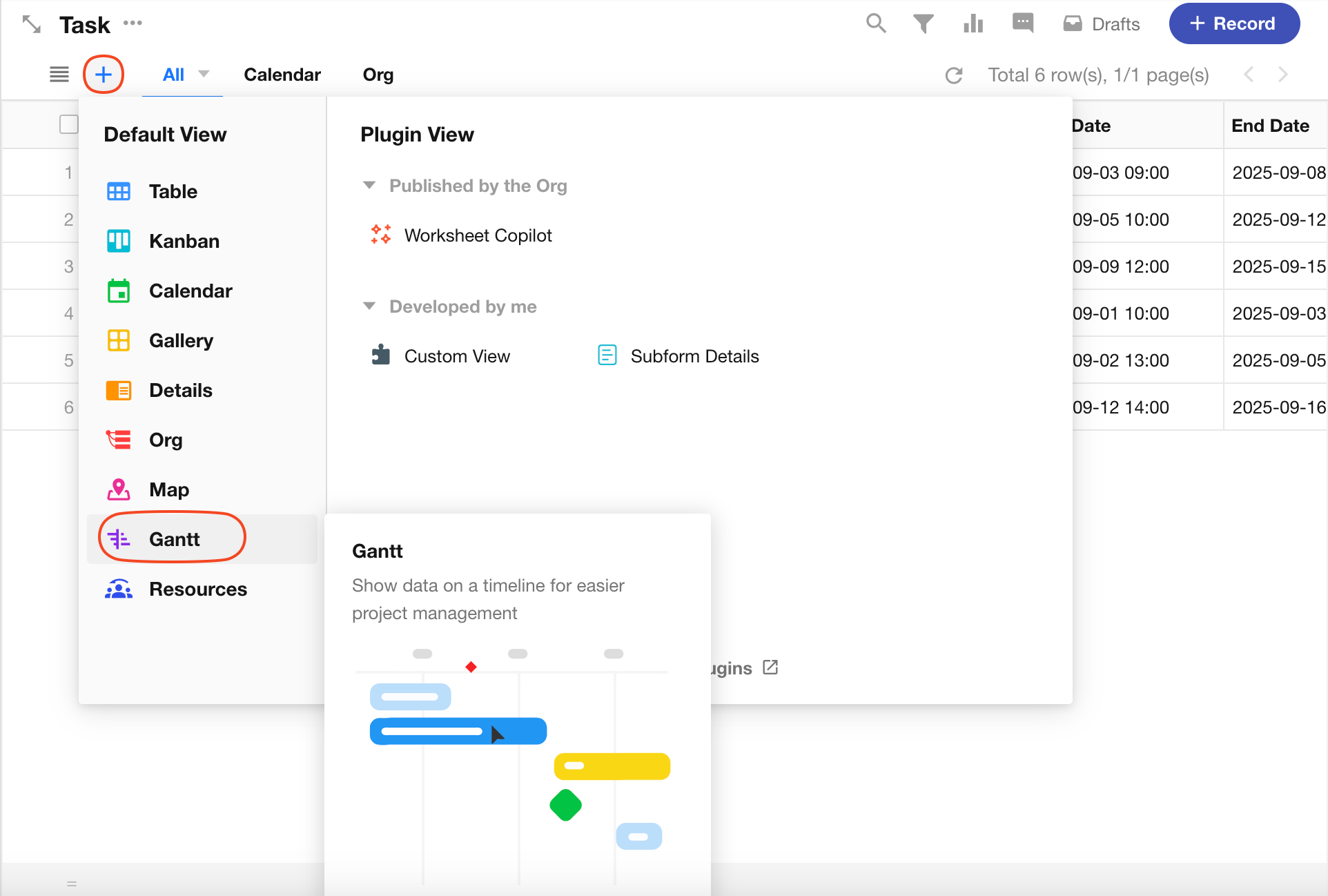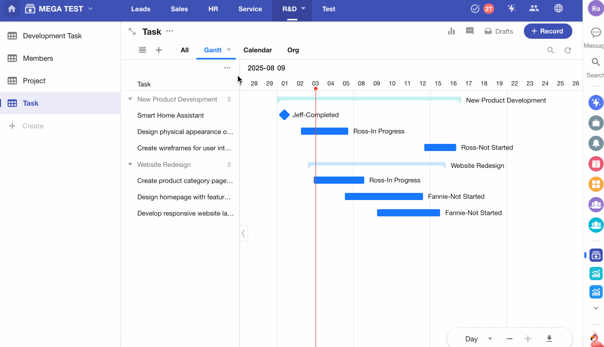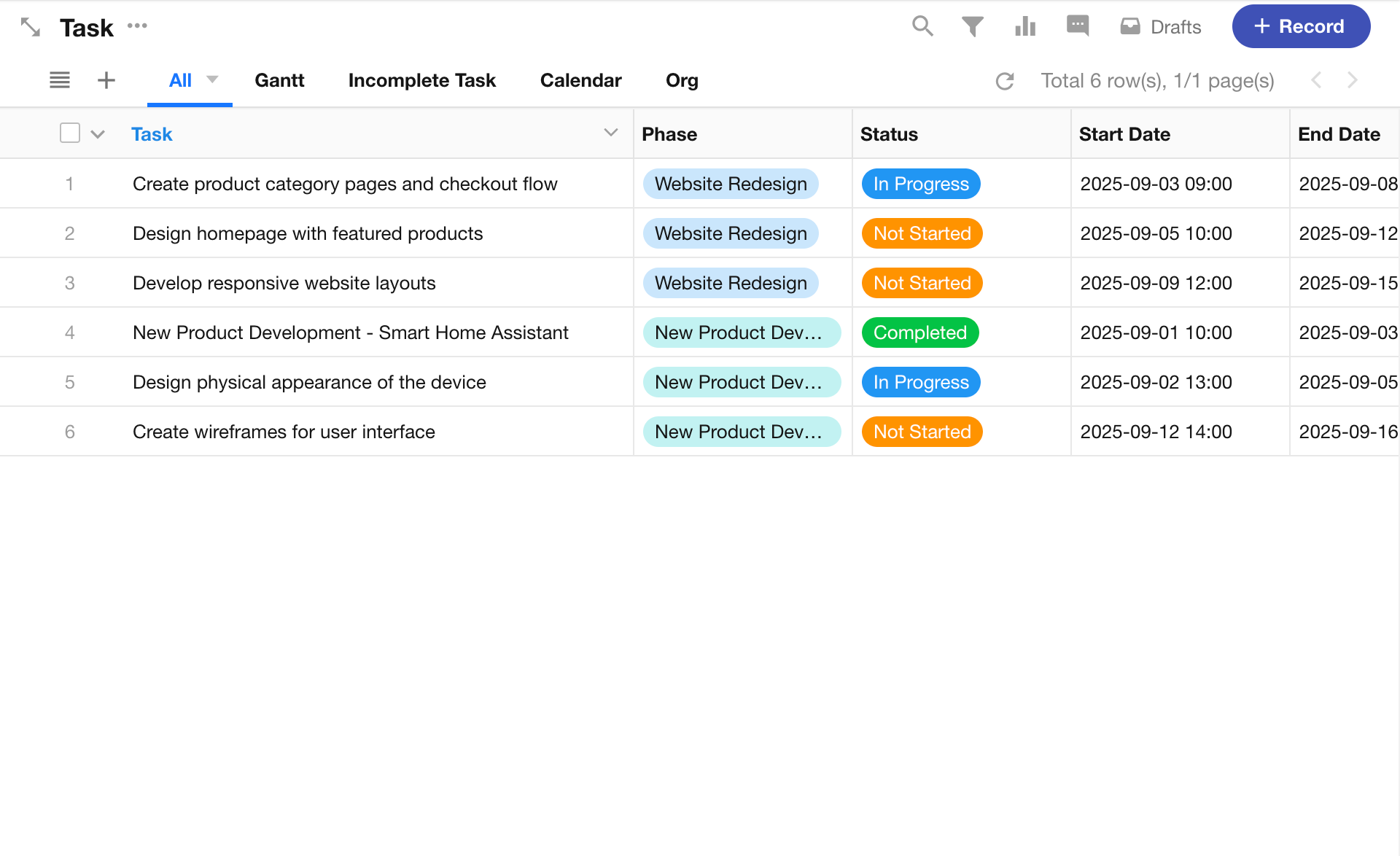 In a Gantt view, the horizontal axis represents time, while the vertical axis lists data records (tasks or activities). Each record is displayed as a horizontal bar, where the position and length indicate the start/end date, duration, and sequential relationship between tasks.