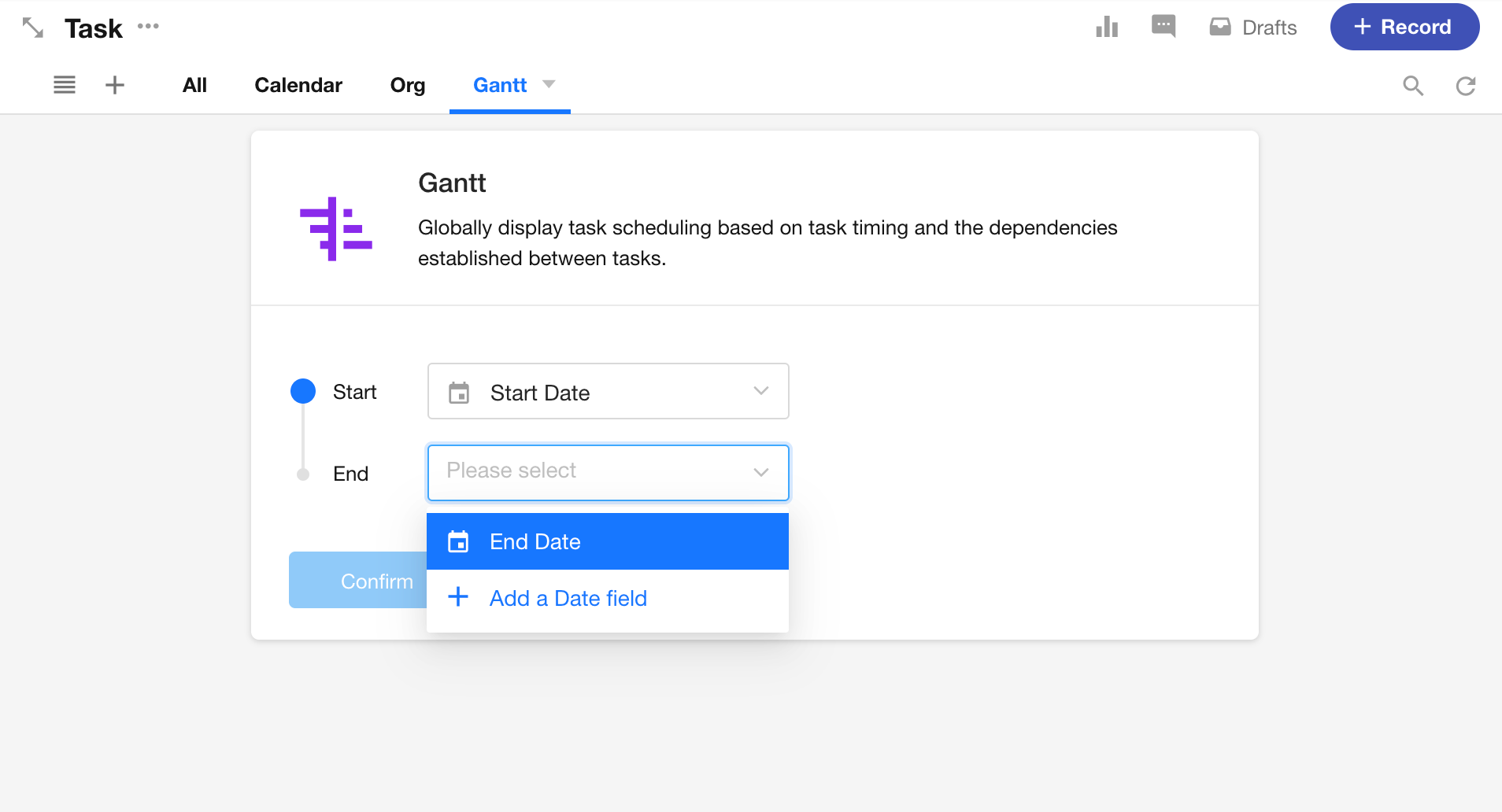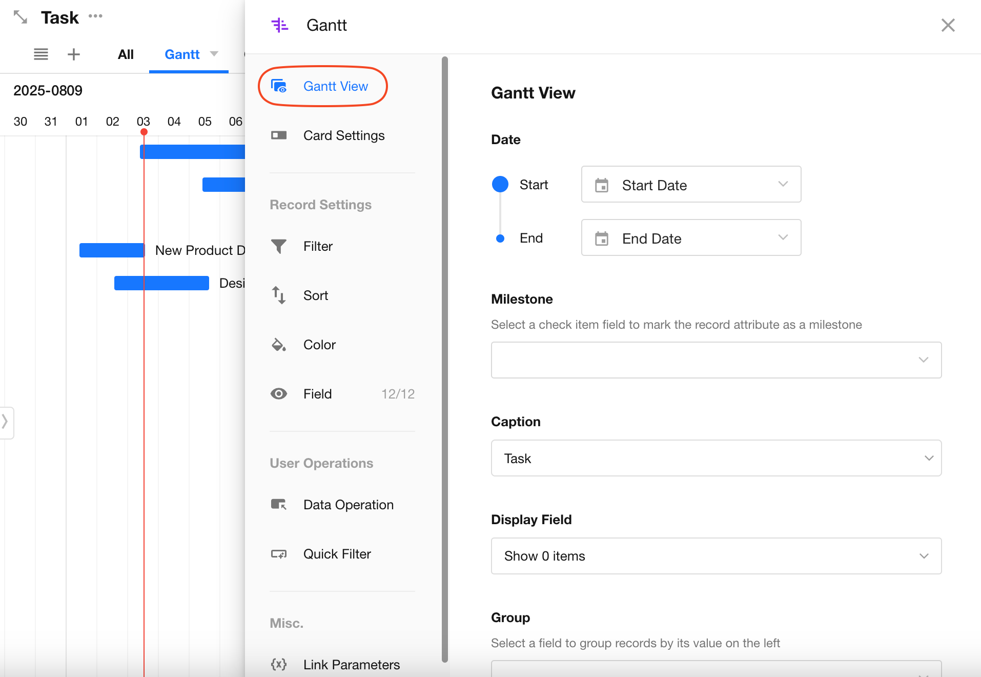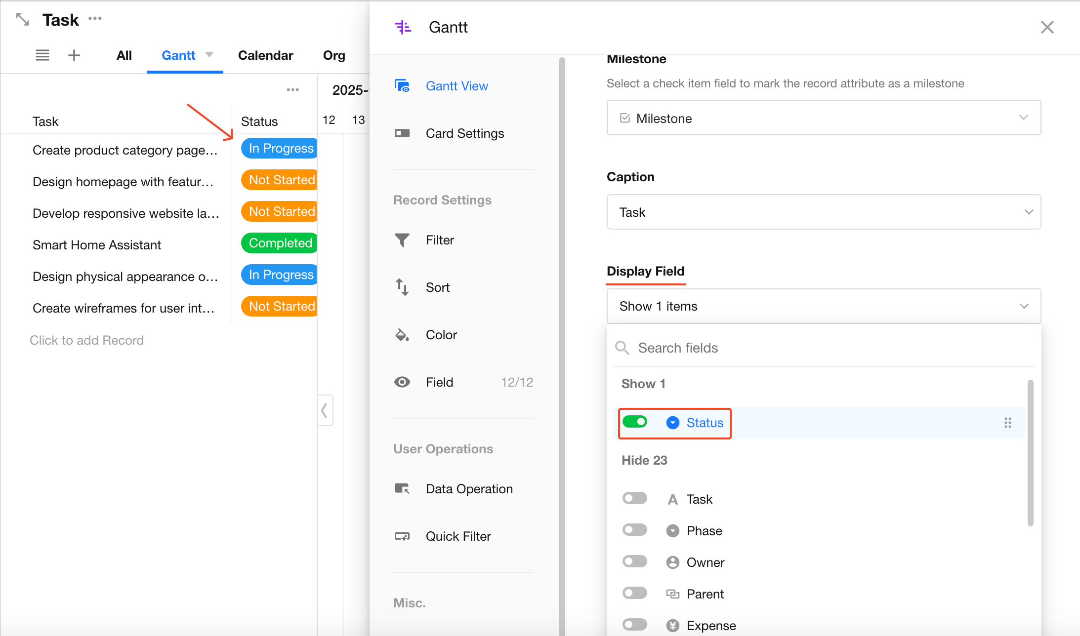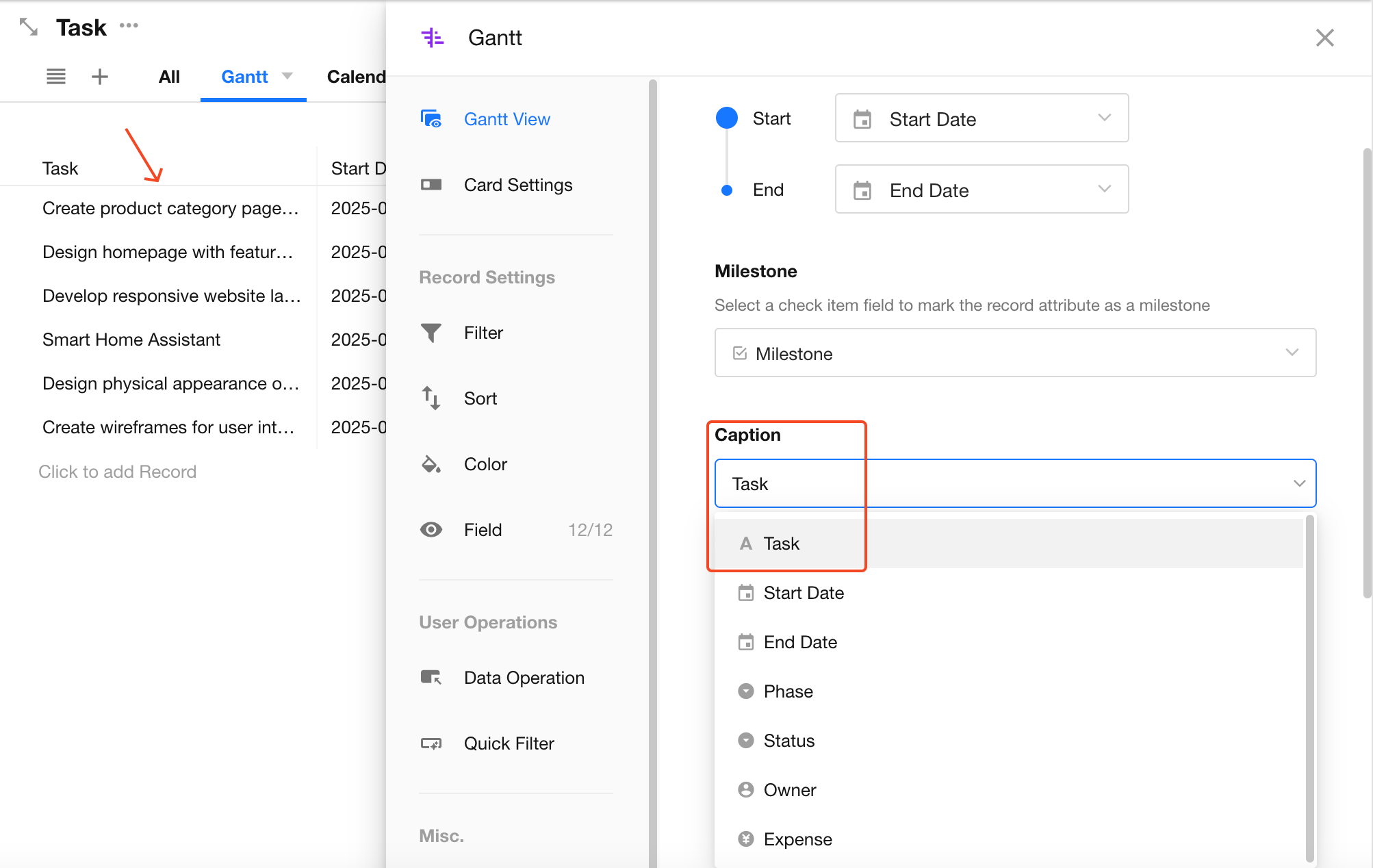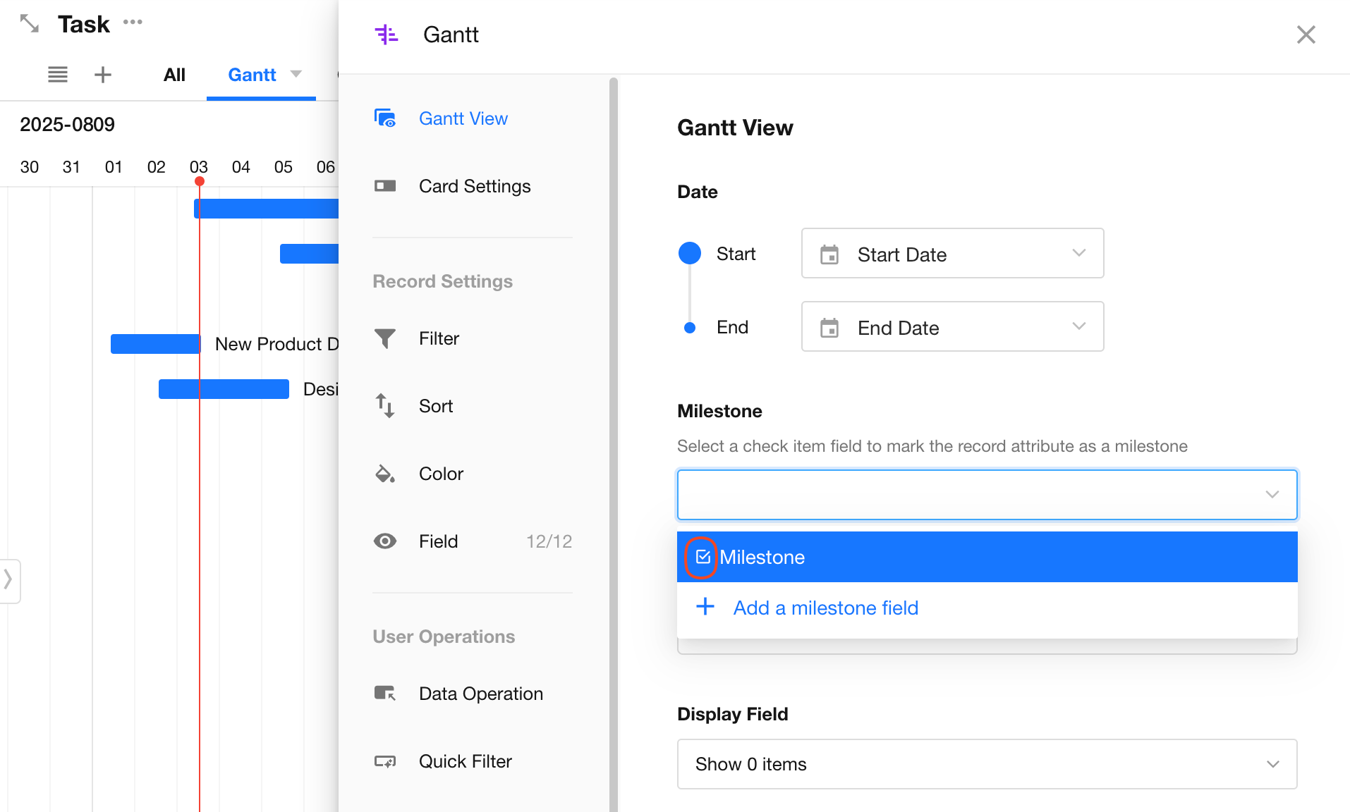 Select a check item field to indicate whether a task is a milestone. If the field doesn't exist, you can create one.
