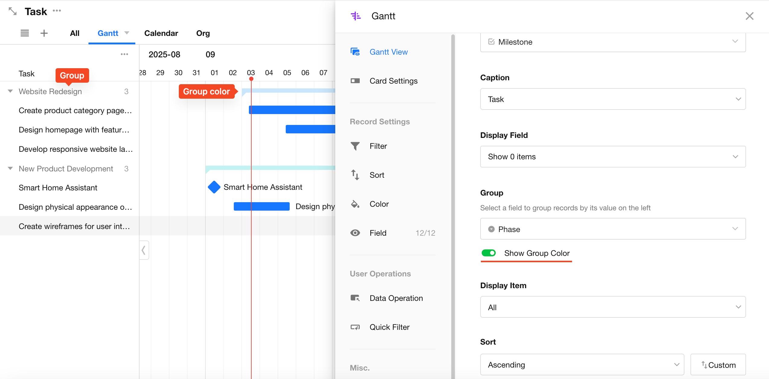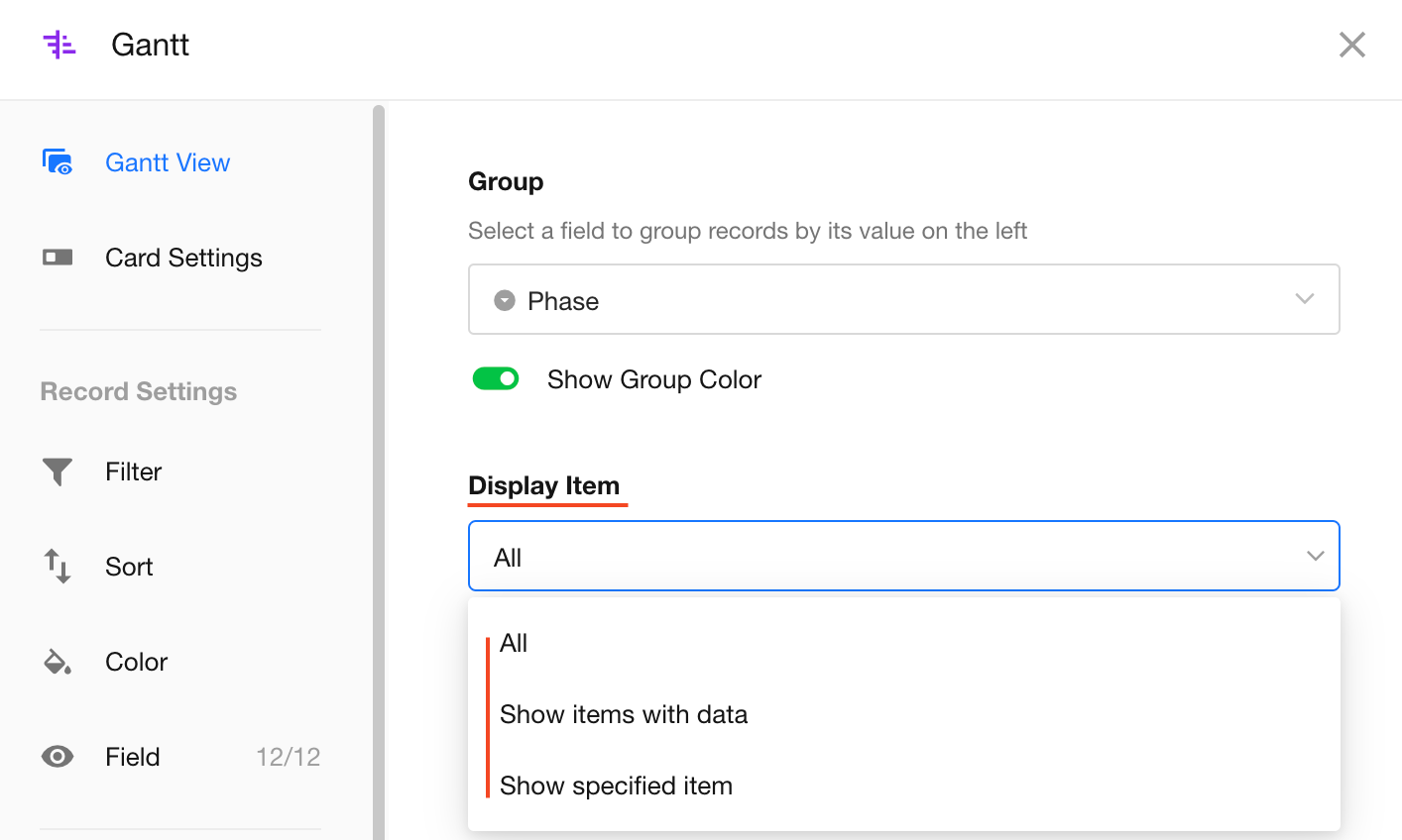 Group records on the left by project, phase, or other fields. Supported fields include:
