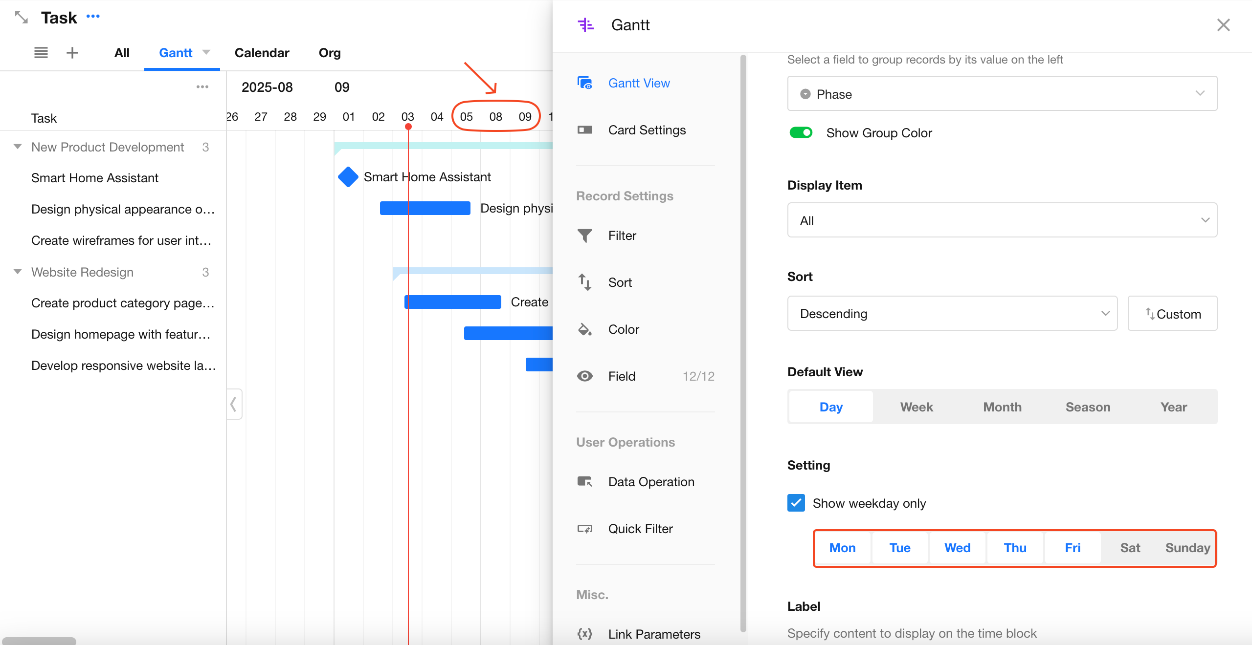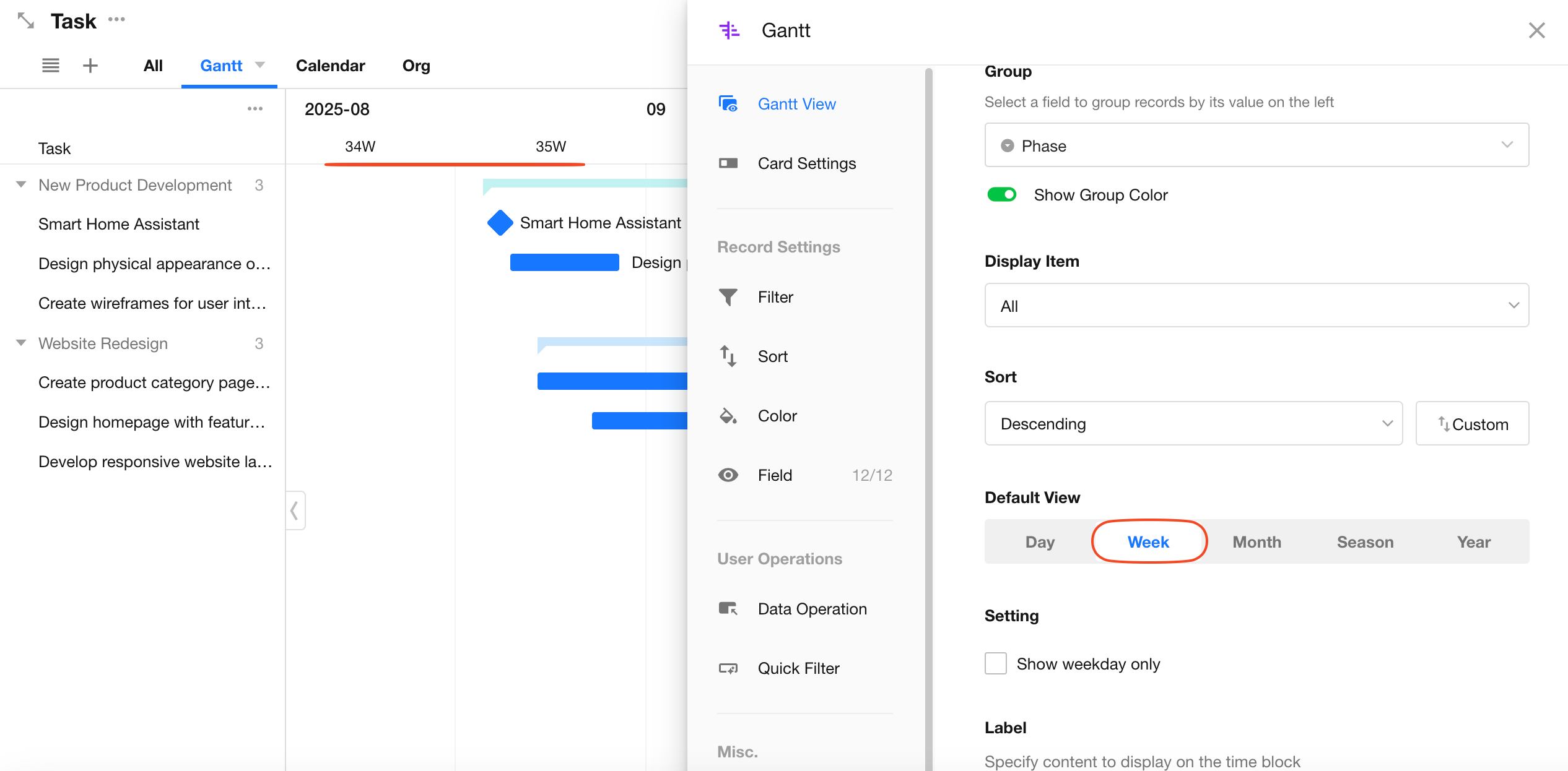 Set the default zoom level for the timeline—day, week, month, quarter, or year. Users can later adjust manually.