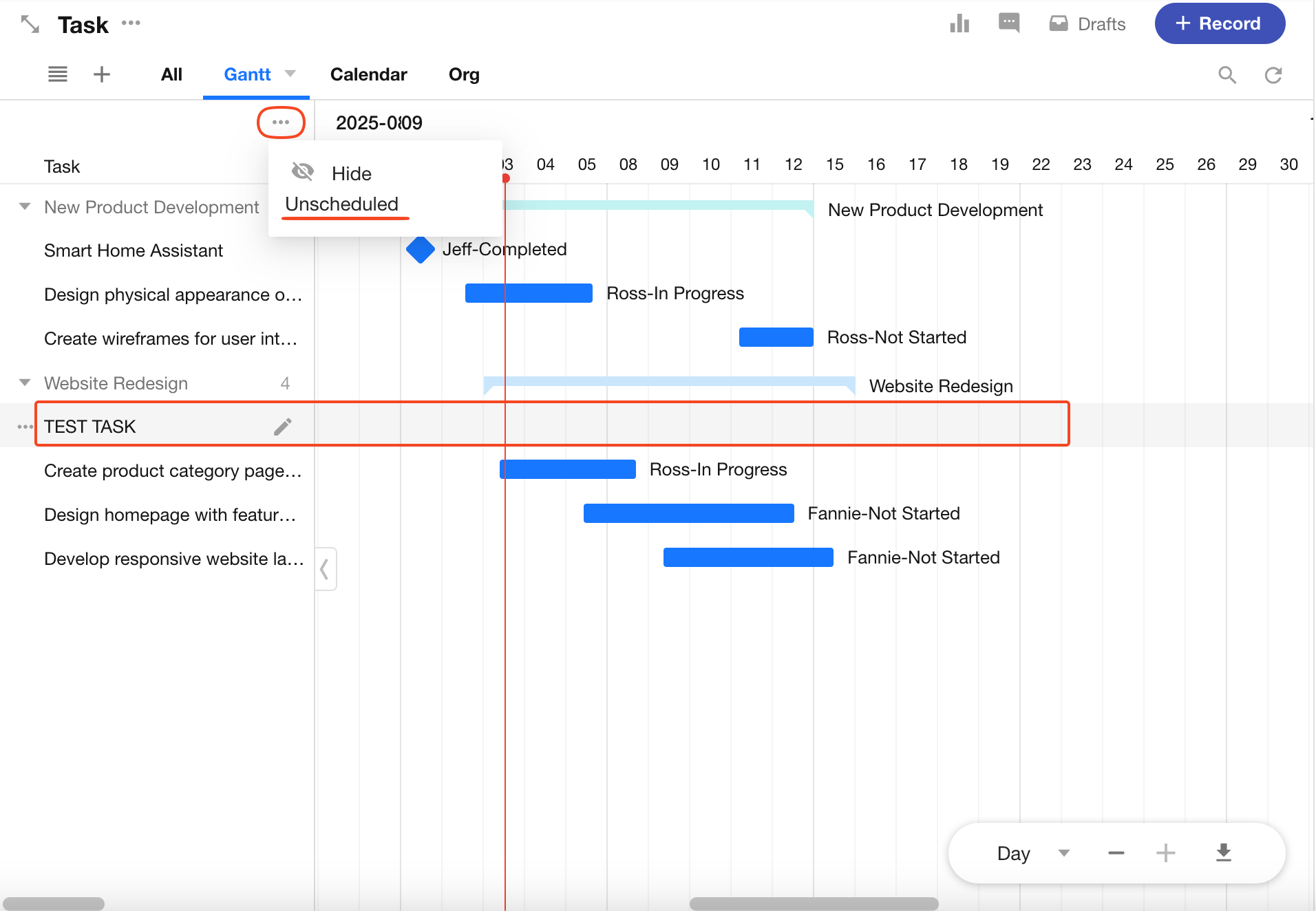 Records without both start and end dates are treated as “Unscheduled” and are hidden by default.