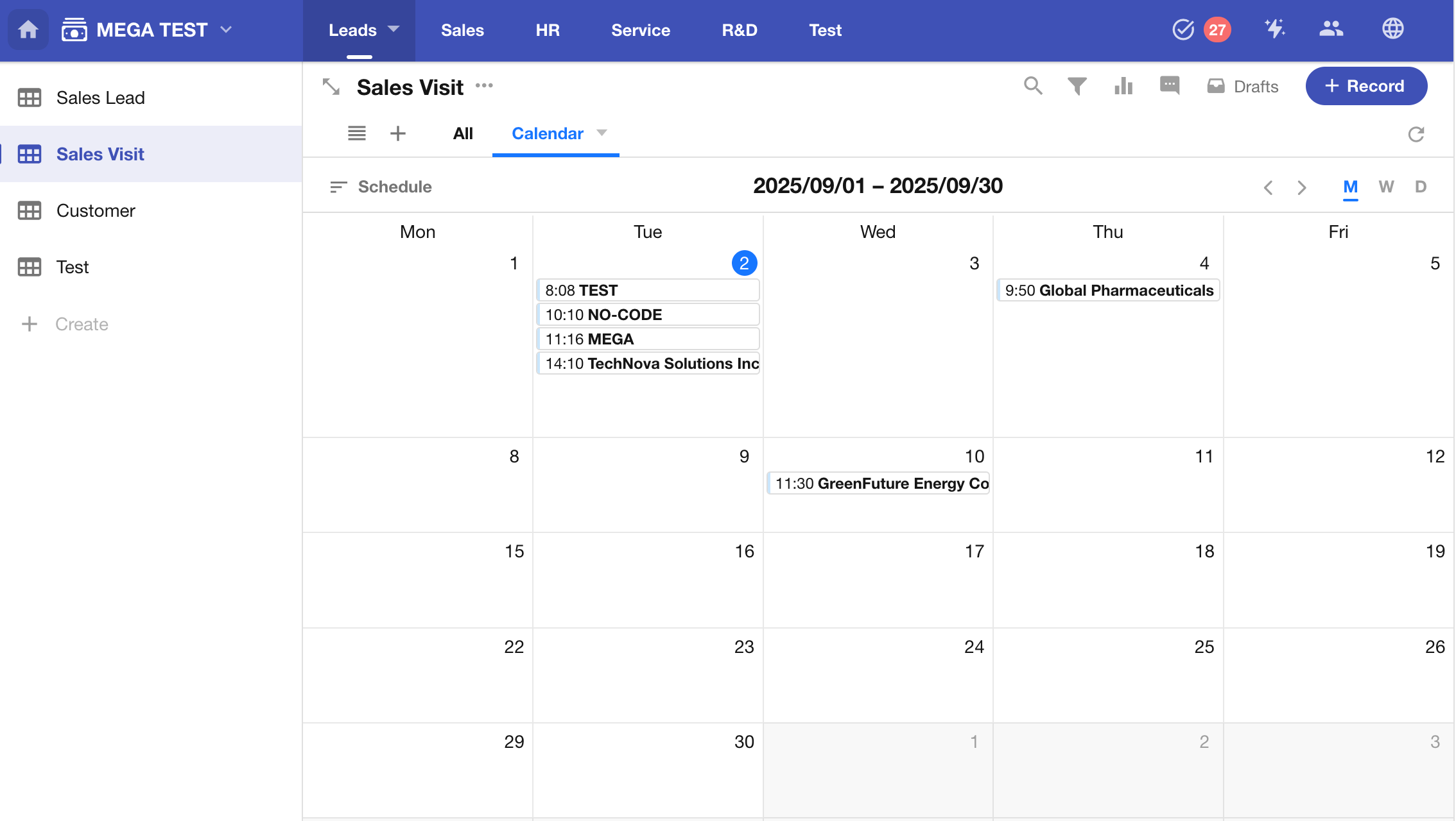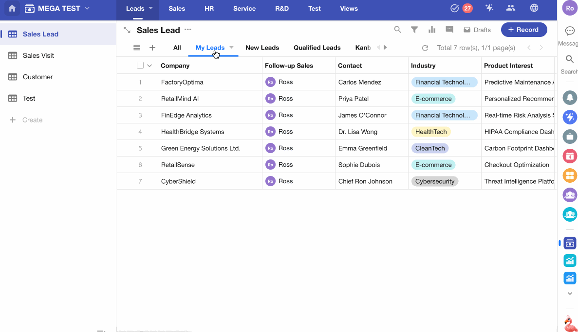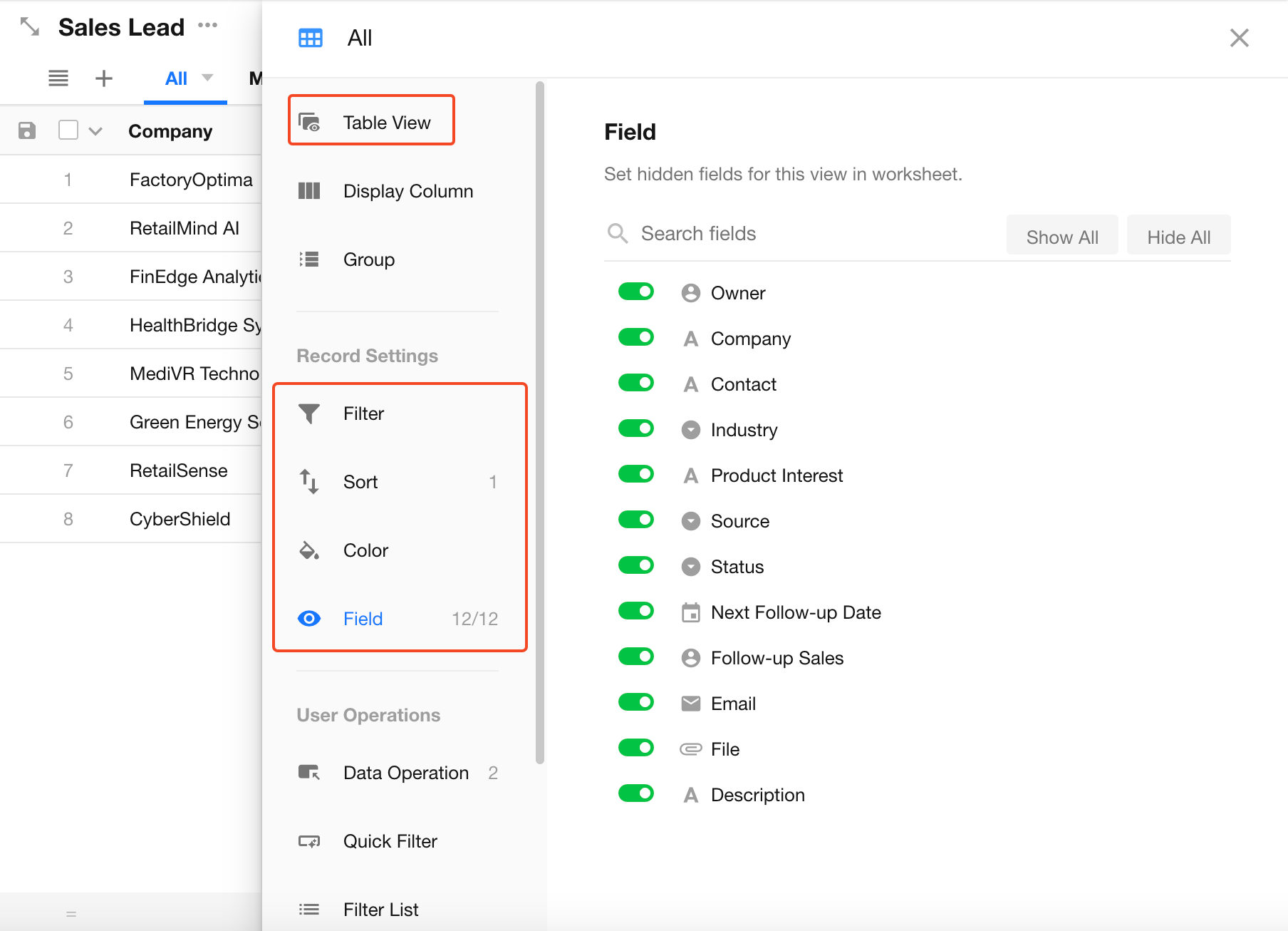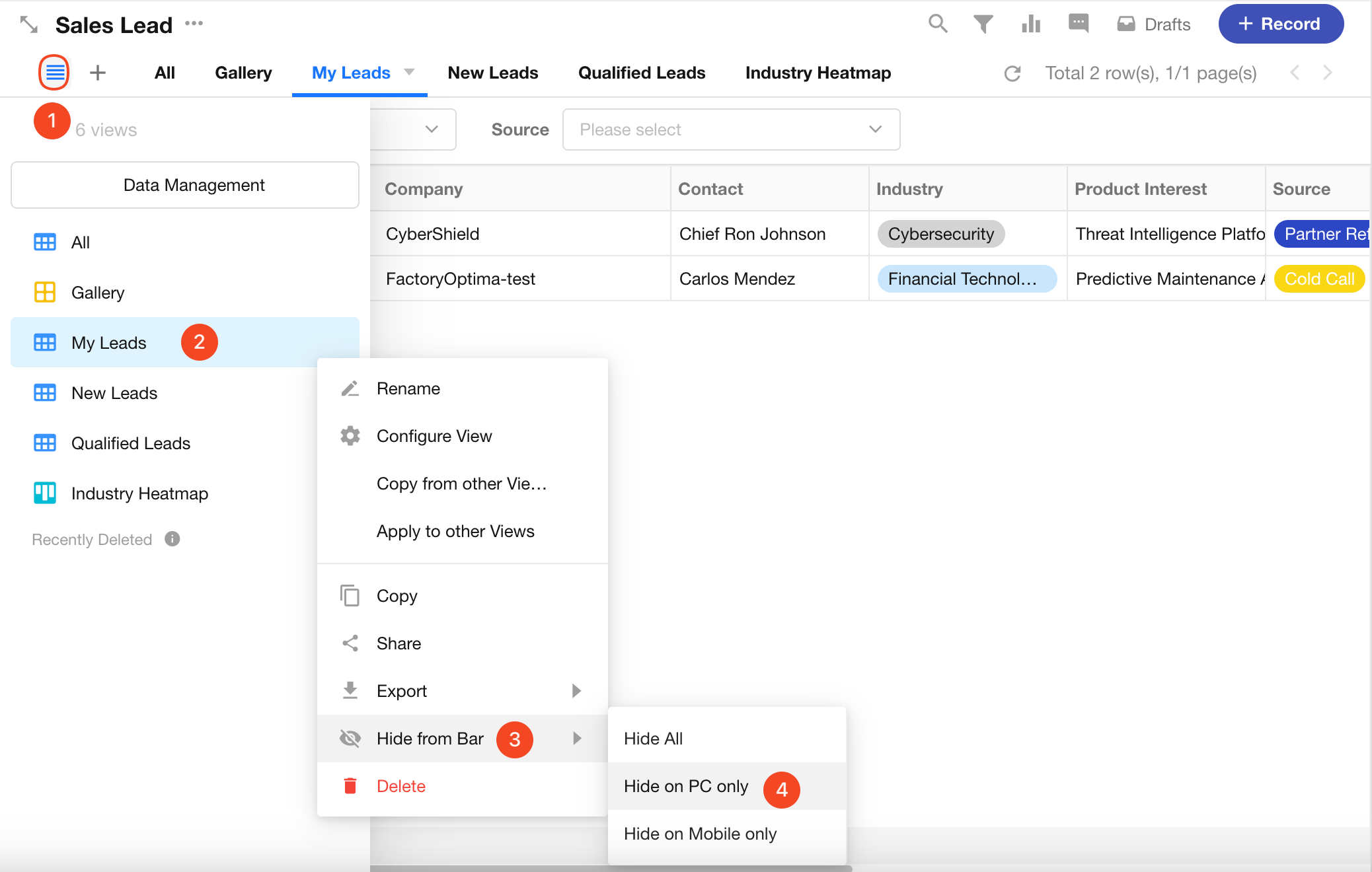 In the view list, users can configure whether a view appears in the sidebar and whether it is visible on Web or Mobile App.