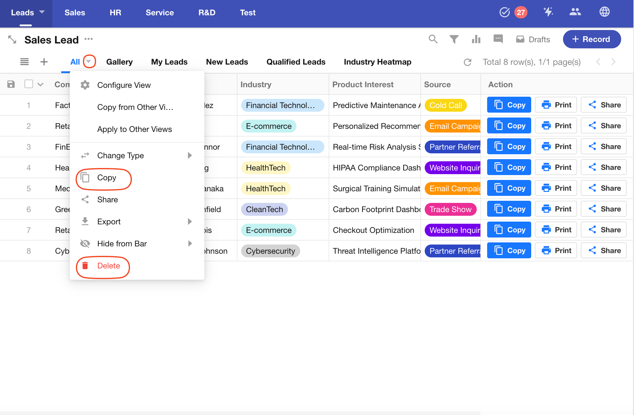 Click the button to the right of the view name, then select "Copy" or "Delete". Copying or deleting views will not affect the data in the worksheet.