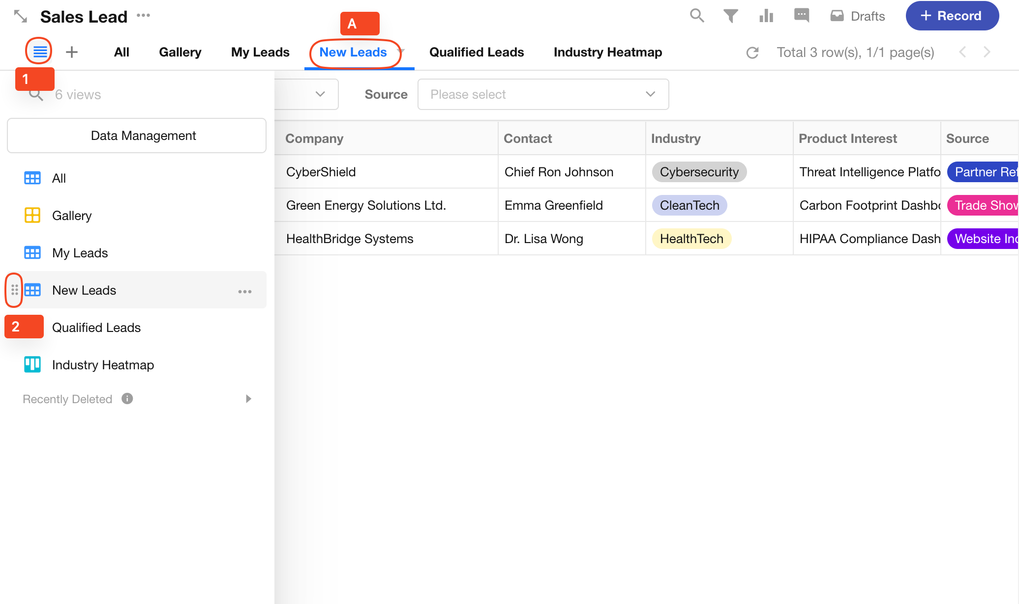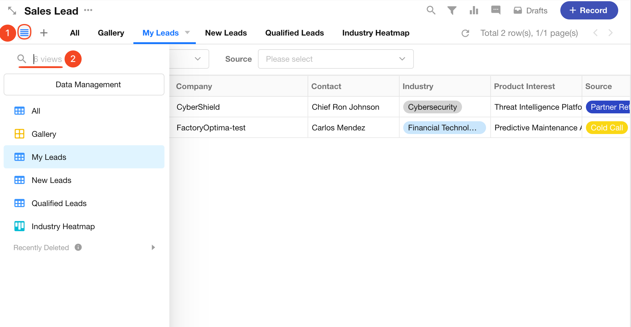 Click the button to the right of the view name, then select "Change Type". Table views, board views, org views, gallery views, calendar views, Gantt views, and others can be freely changed to other view types.