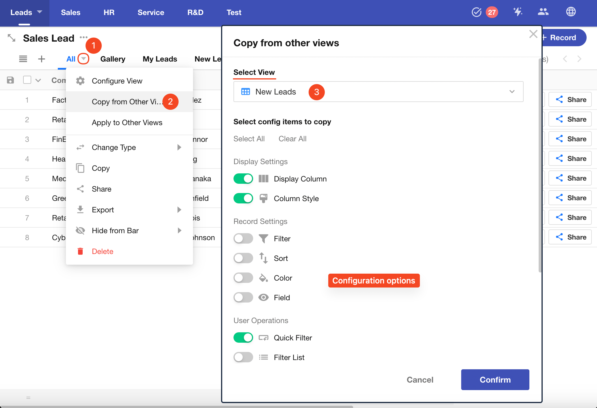 Click the view name, then click the button to the right of the view name and select "Copy from Other Views" to copy configurations from another view to the current view.