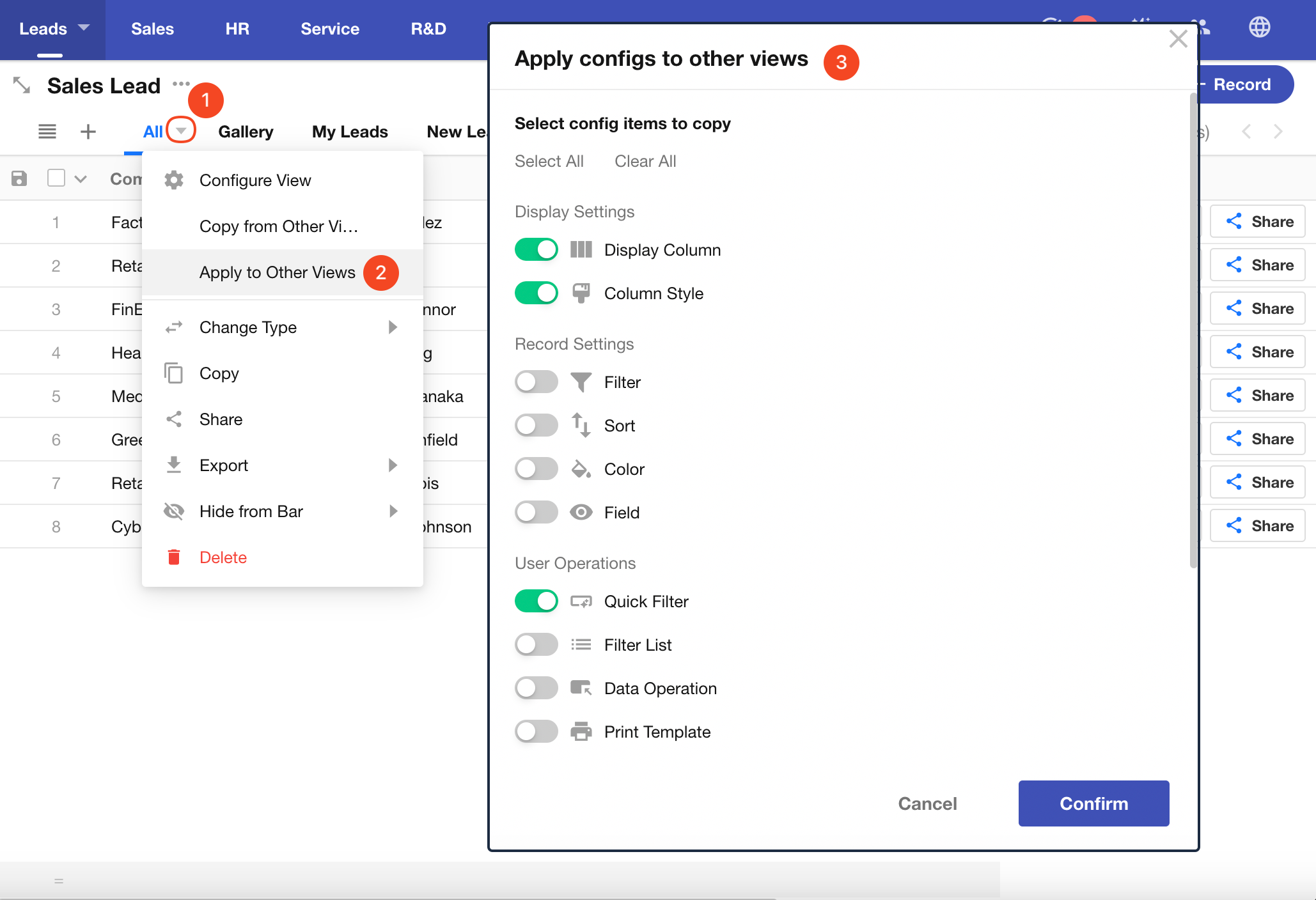 Click the view name, then click the button to the right of the view name and select "Apply to Other Views" to apply the current view's configuration to other views. This will overwrite the configurations of the target views.