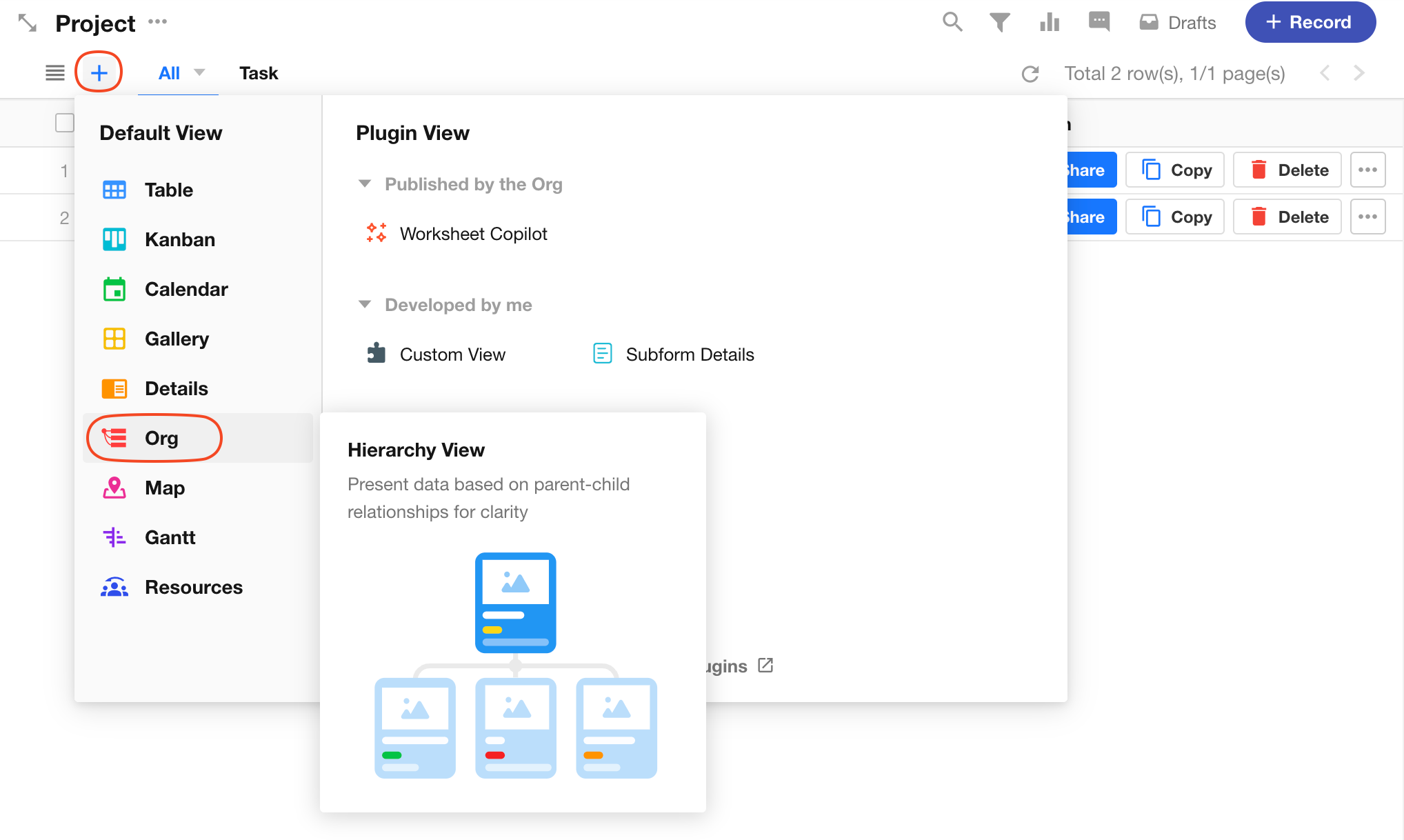 The org view, which presents records with 1-to-many relationships as a hierarchical tree. It can be