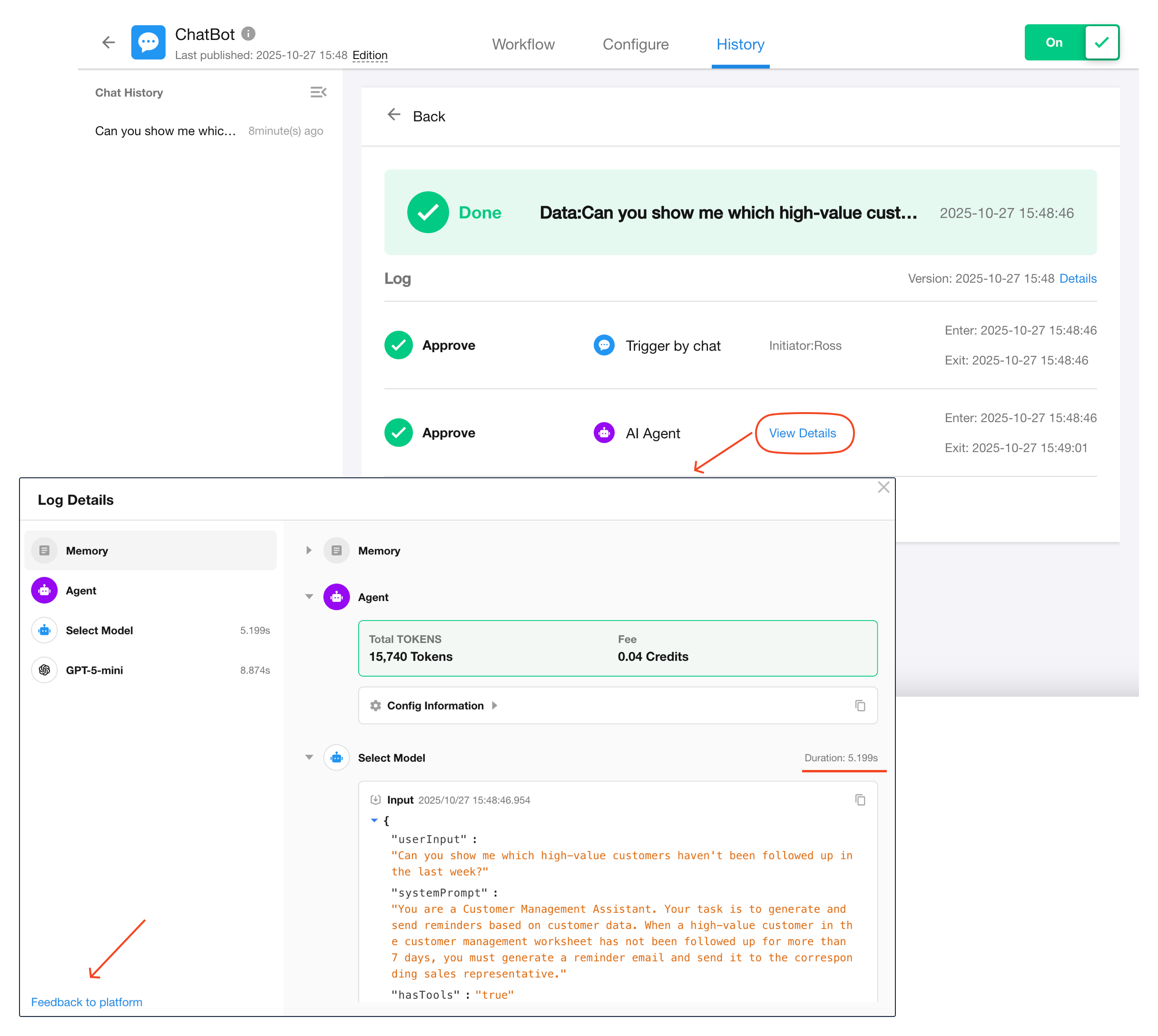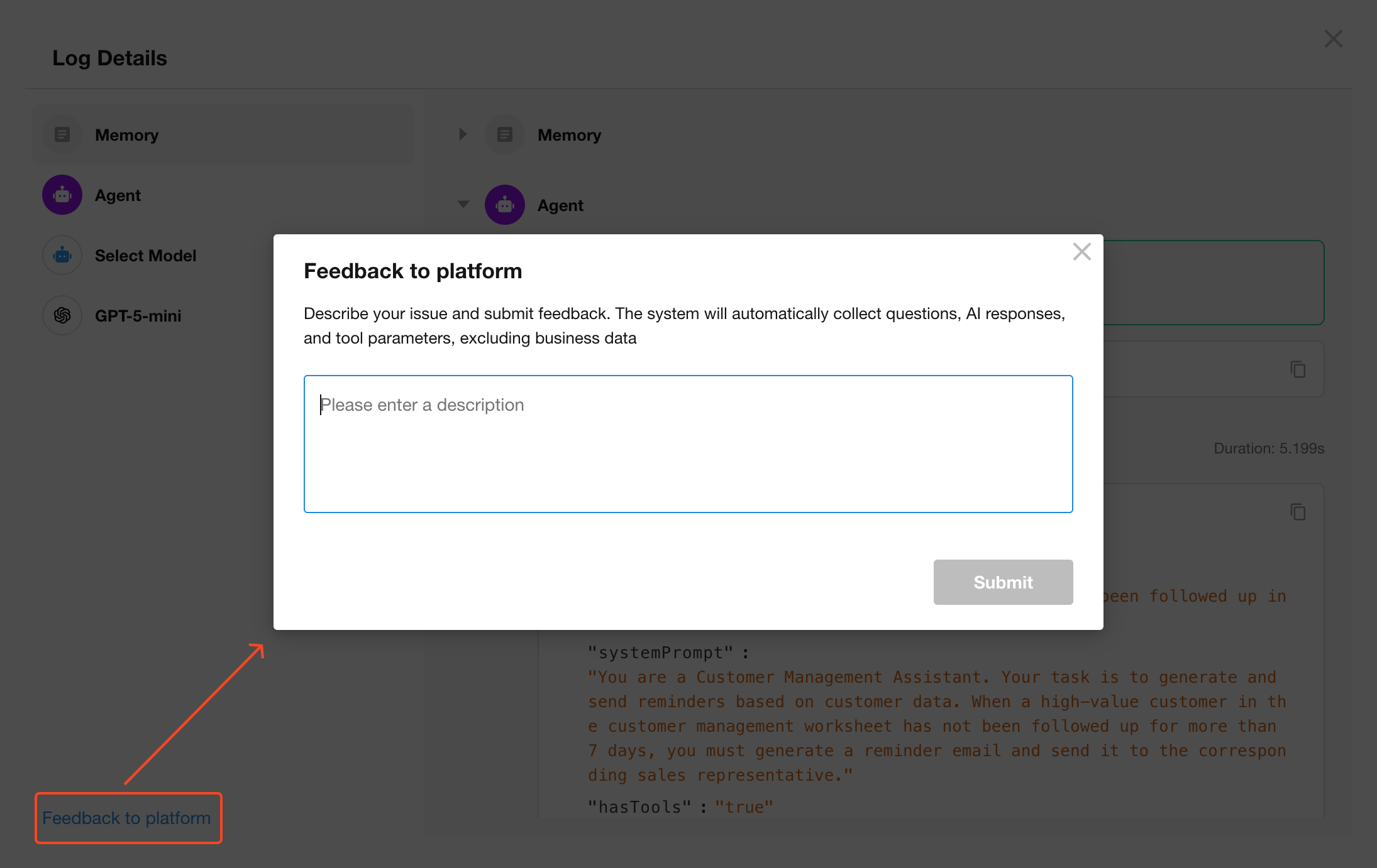 If you encounter issues or have questions about an AI Agent’s behavior, click Feedback to Platform at the bottom-left corner of the log viewer.