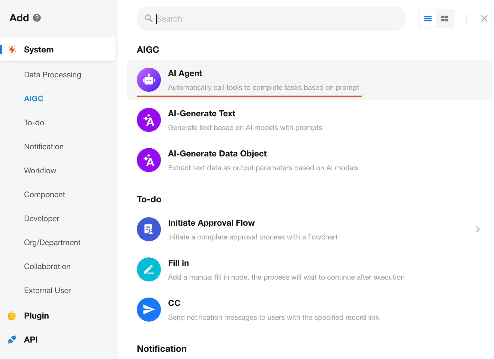 By leveraging large language models (LLMs), the AI Agent node can execute tasks such as data querying, information summarization, and report generation—based on context data, tool configurations, and prompts—enabling workflows to handle processes intelligently.