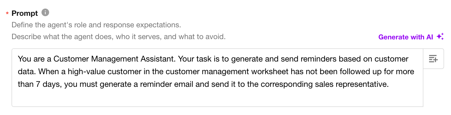 Set a filter like [Customer Status = High Value AND Last Follow-Up ≥ 7 Days]. The Agent will then only retrieve matching customer records when performing reminder tasks.