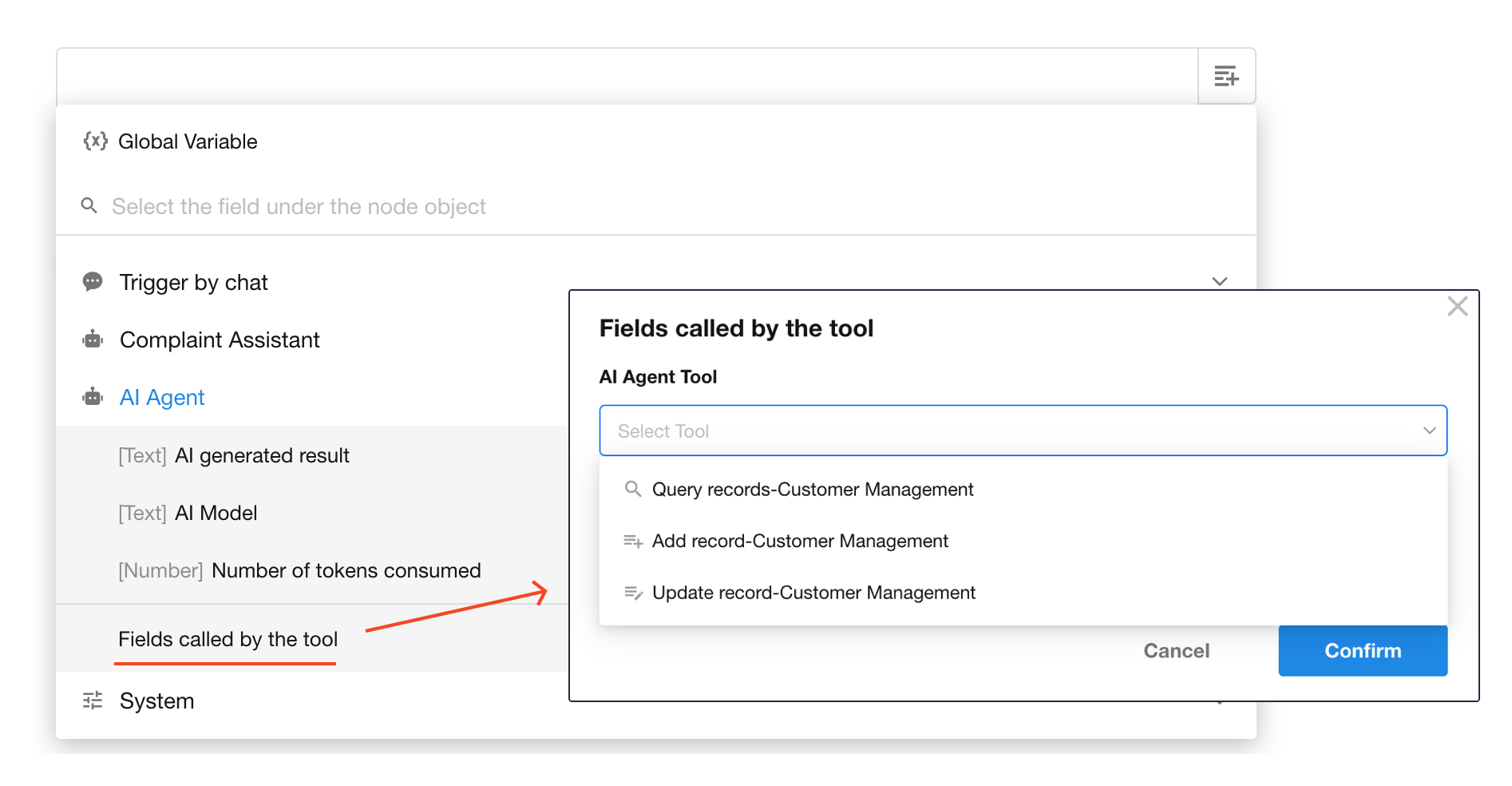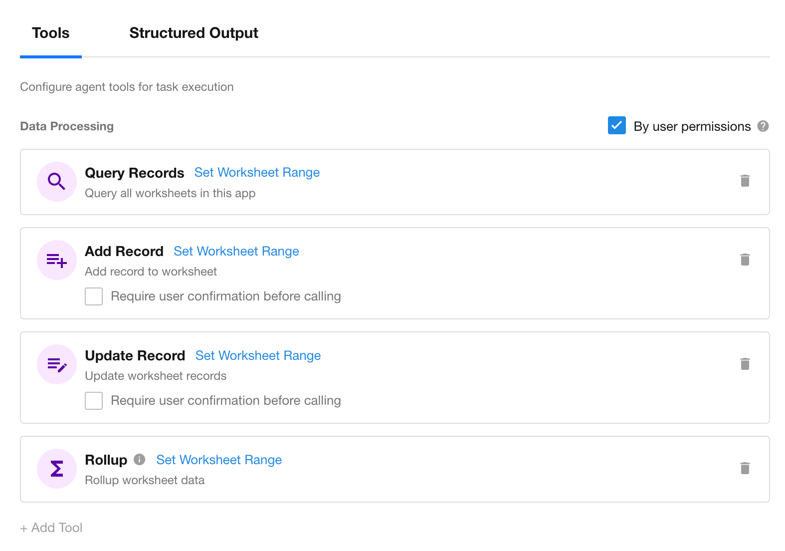 When the AI Agent invokes tools like Query Records, Add Record, or Update Record, and a worksheet scope is defined, the fields from the affected records can be referenced by downstream nodes.