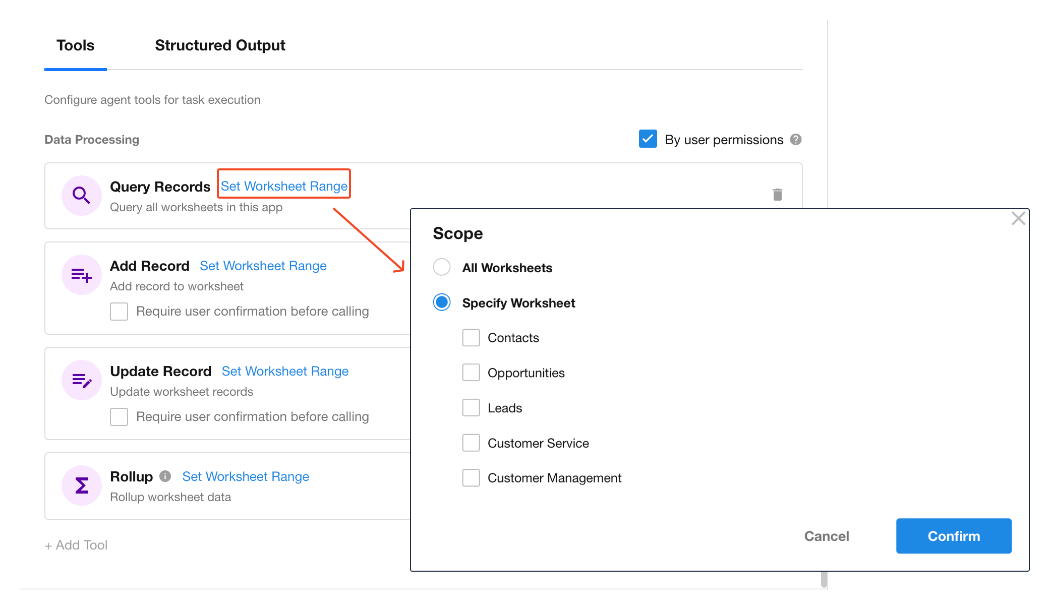 When using data handling tools, you can define the worksheet scope that the Agent is allowed to access.