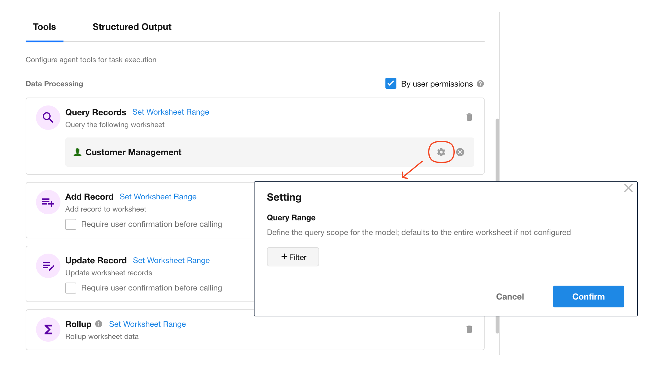 In enterprise-grade systems, data security and access control are crucial. HAP provides two levels of access control for AI Agent nodes: Worksheet Scope and Query Filters. These settings ensure that while enabling intelligent automation, the Agent’s data access boundaries remain clearly defined.
