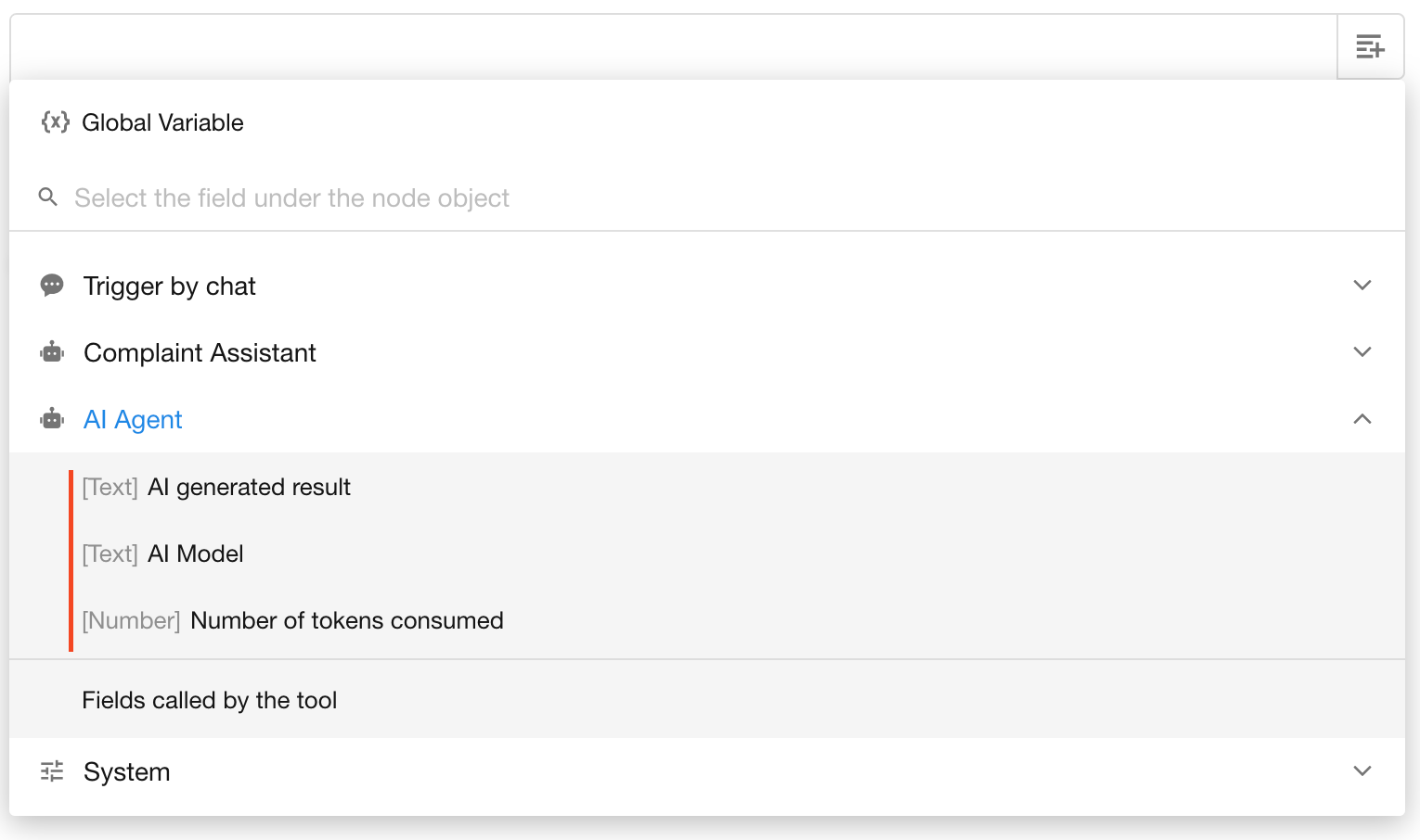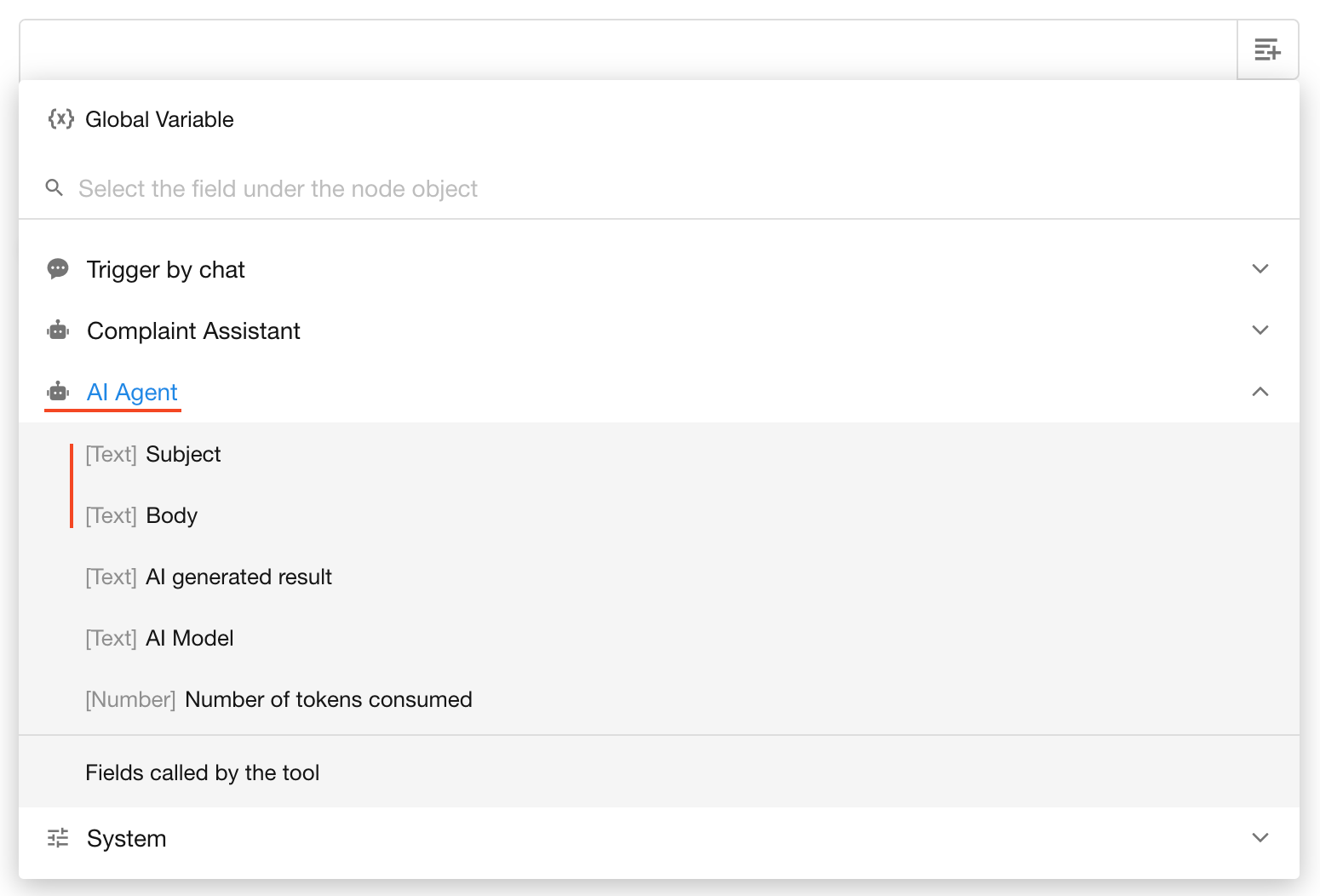 In a downstream node (e.g., an AI-Generate Text node), expand AI Agent → Fields called by the tool, and select the desired field.