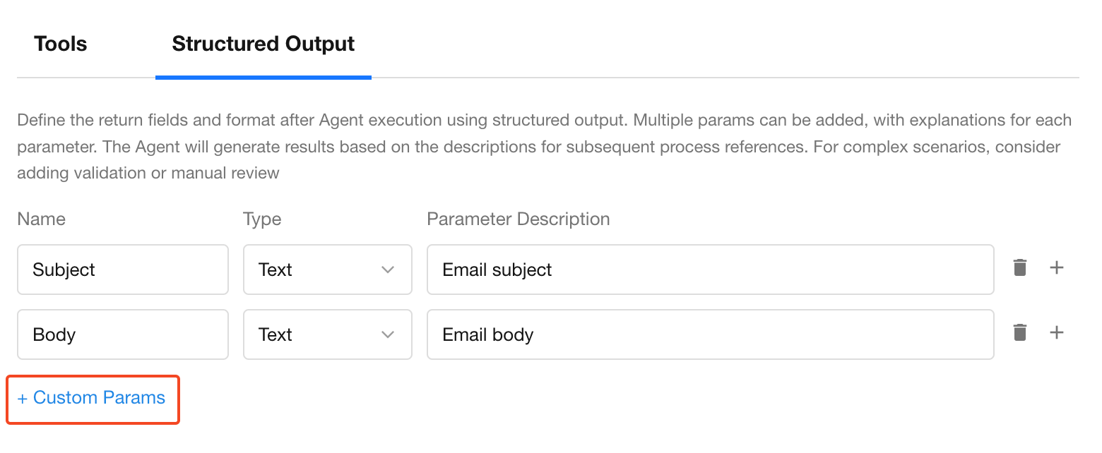 Structured output allows you to define custom fields and output formats. You can add multiple parameters and provide descriptions for each. The Agent will attempt to generate output that matches the format, which can be directly used in downstream workflow steps.
