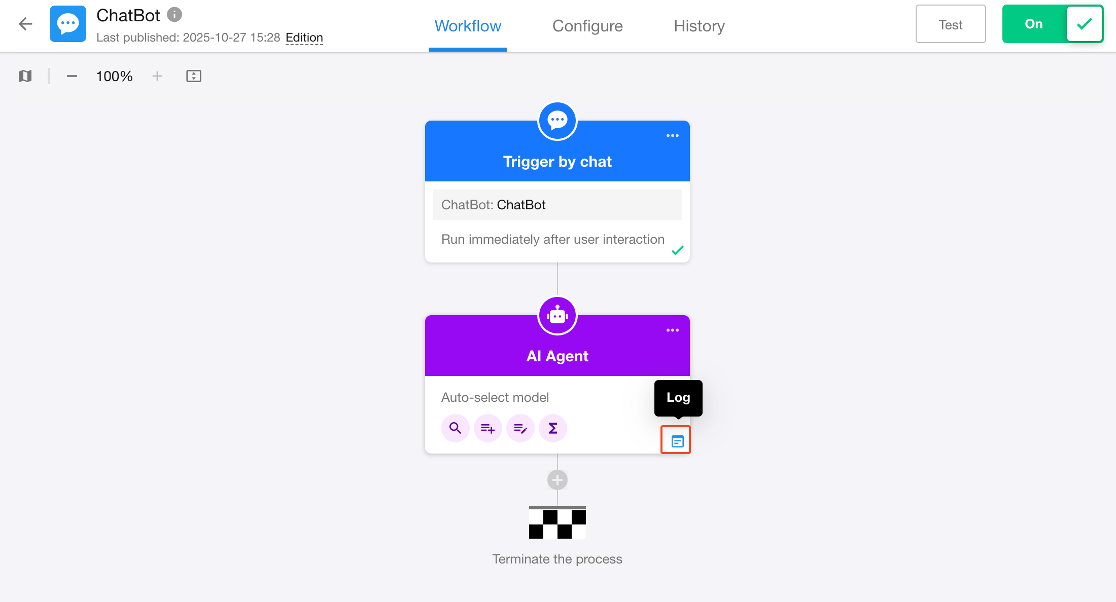 Each time an AI Agent node is executed, a detailed execution log is automatically generated. This log helps users inspect the model's runtime behavior and output.