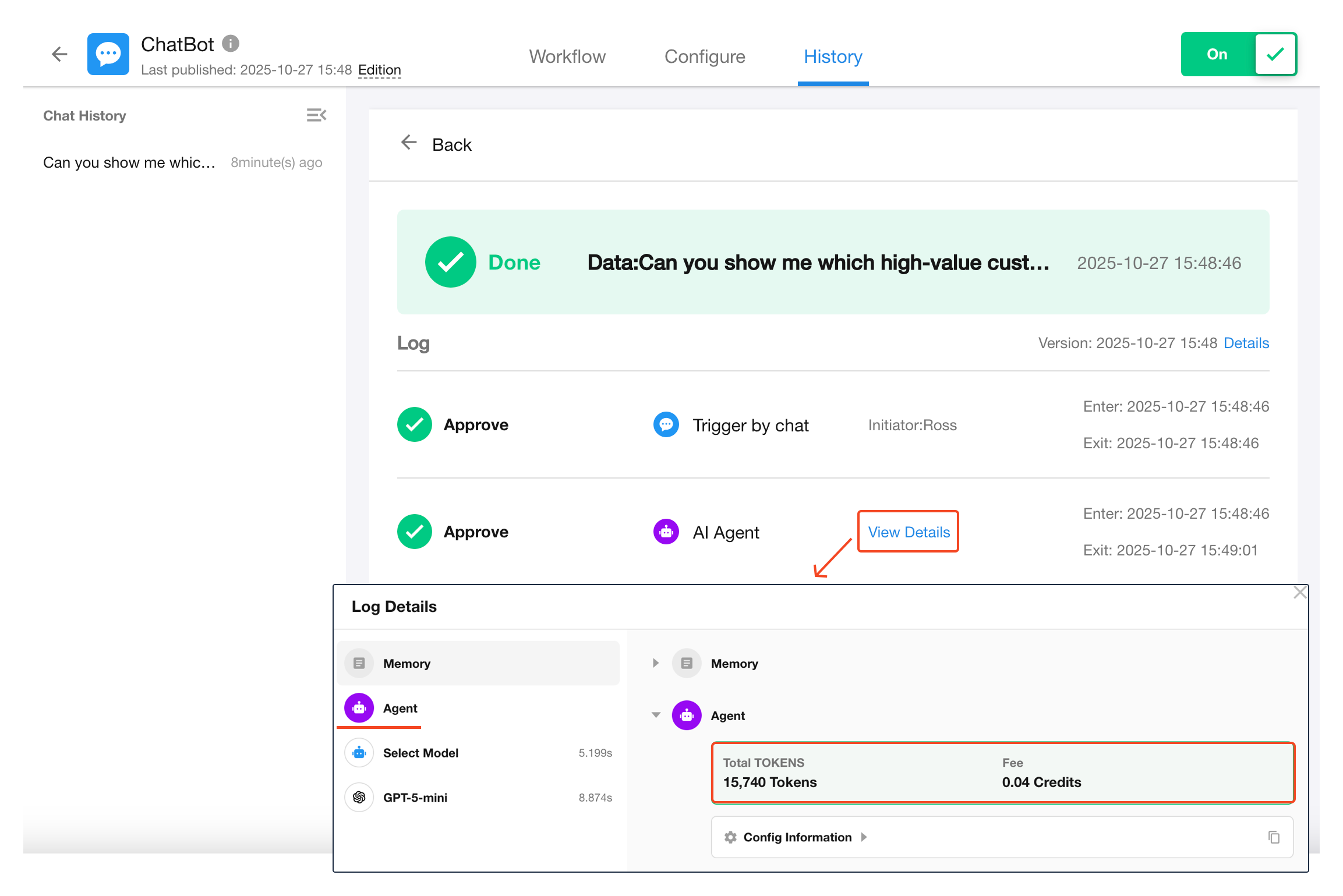 Go to the workflow’s execution history page and click View Details inside the AI Agent node.