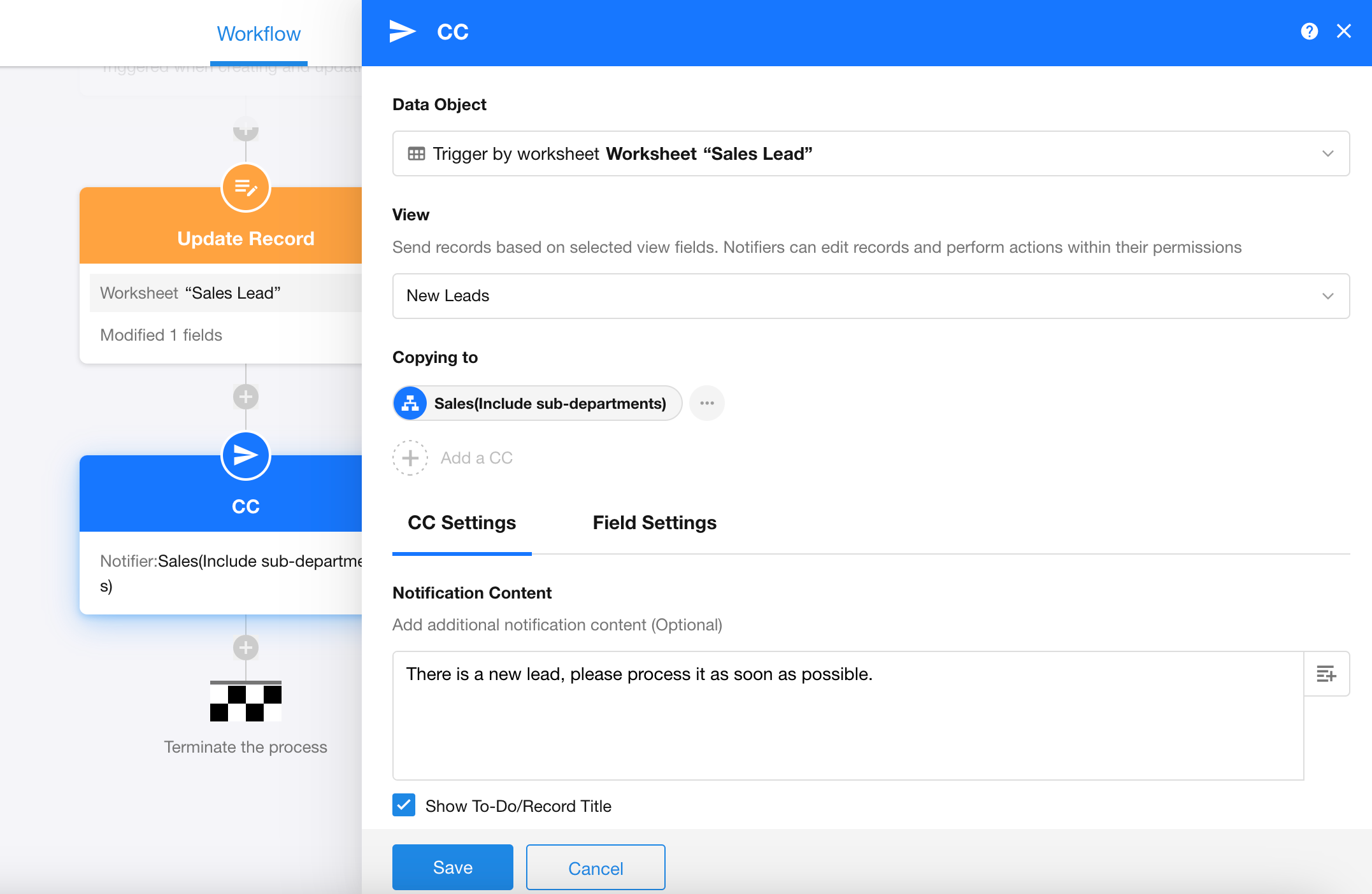 Example: When a new lead enters the worksheet, notify sales personnel to follow up promptly.