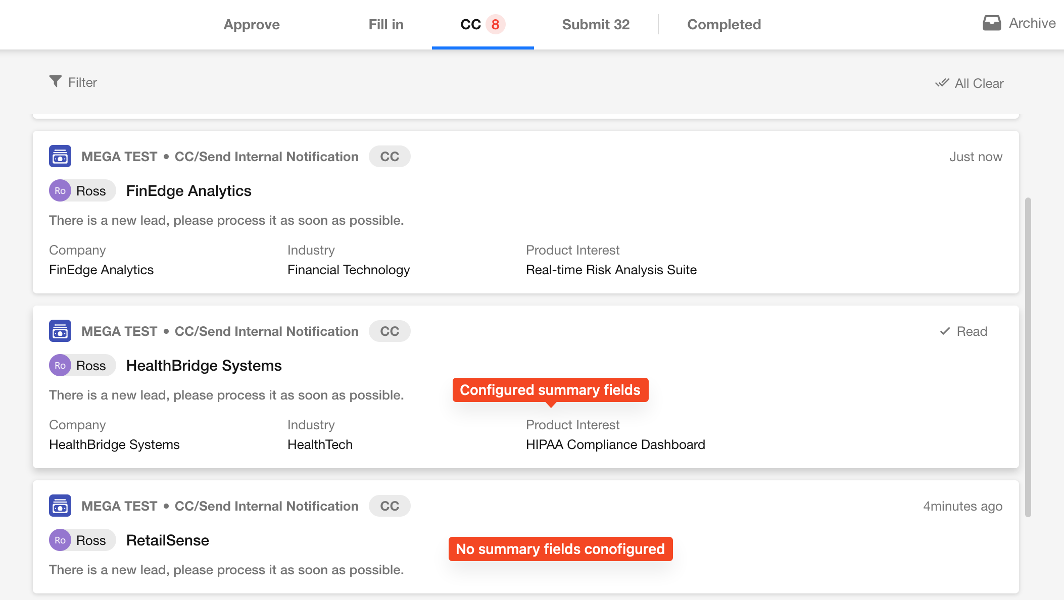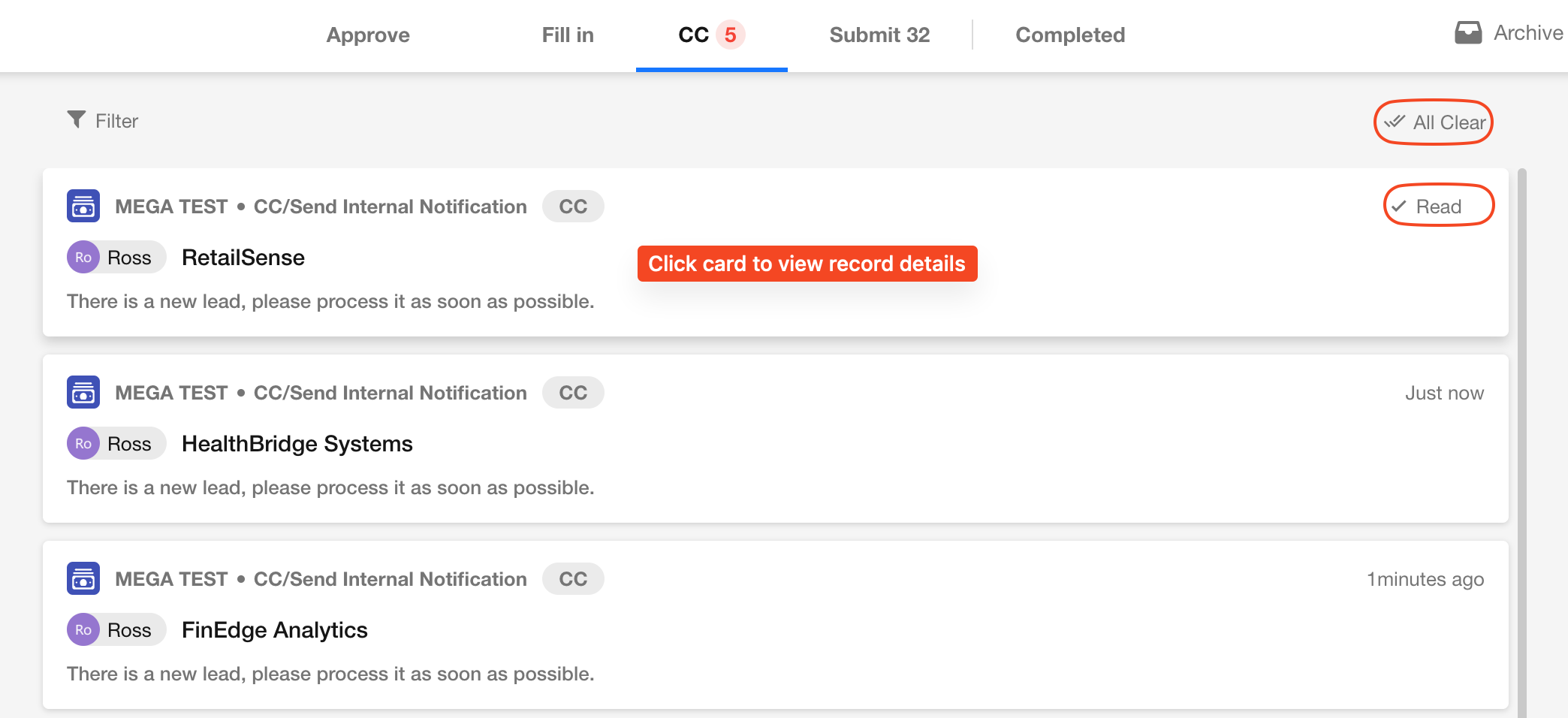 In the To-Do list, click "Read" or "All Clear" to quickly process CC messages, or click cards to view record details.