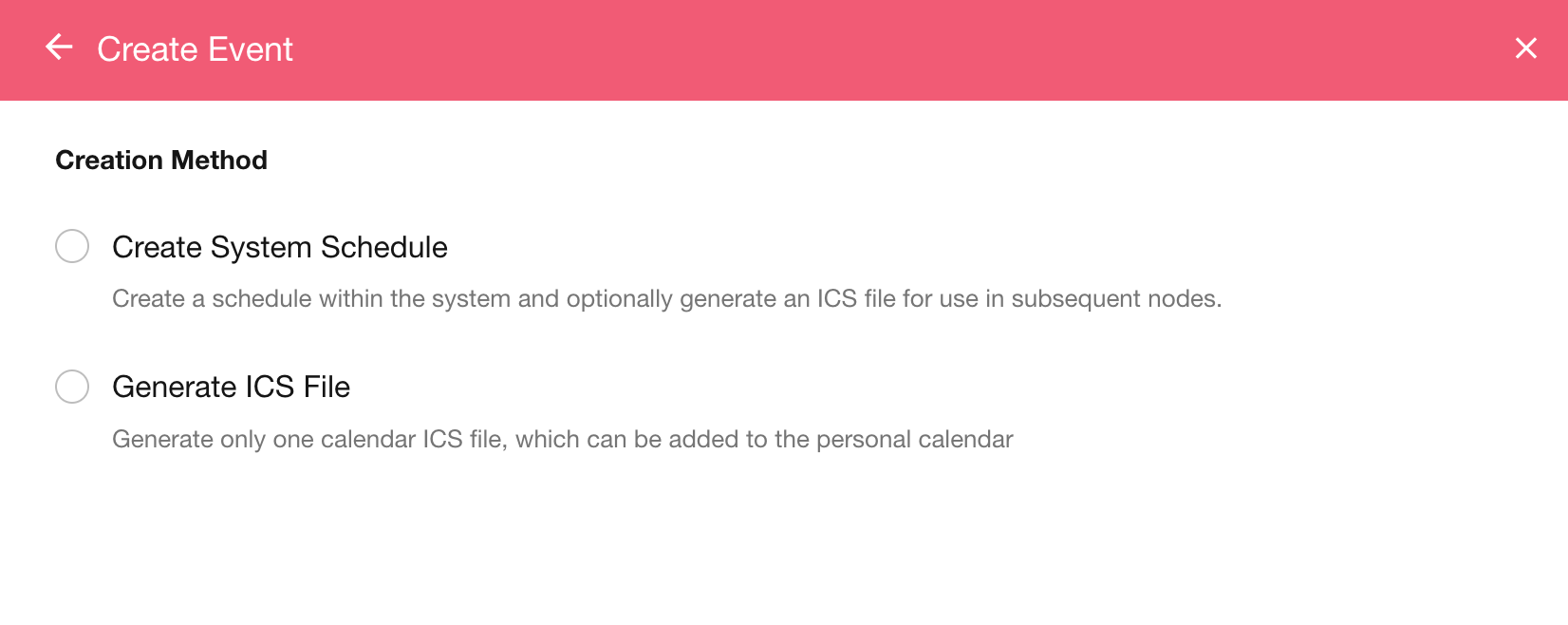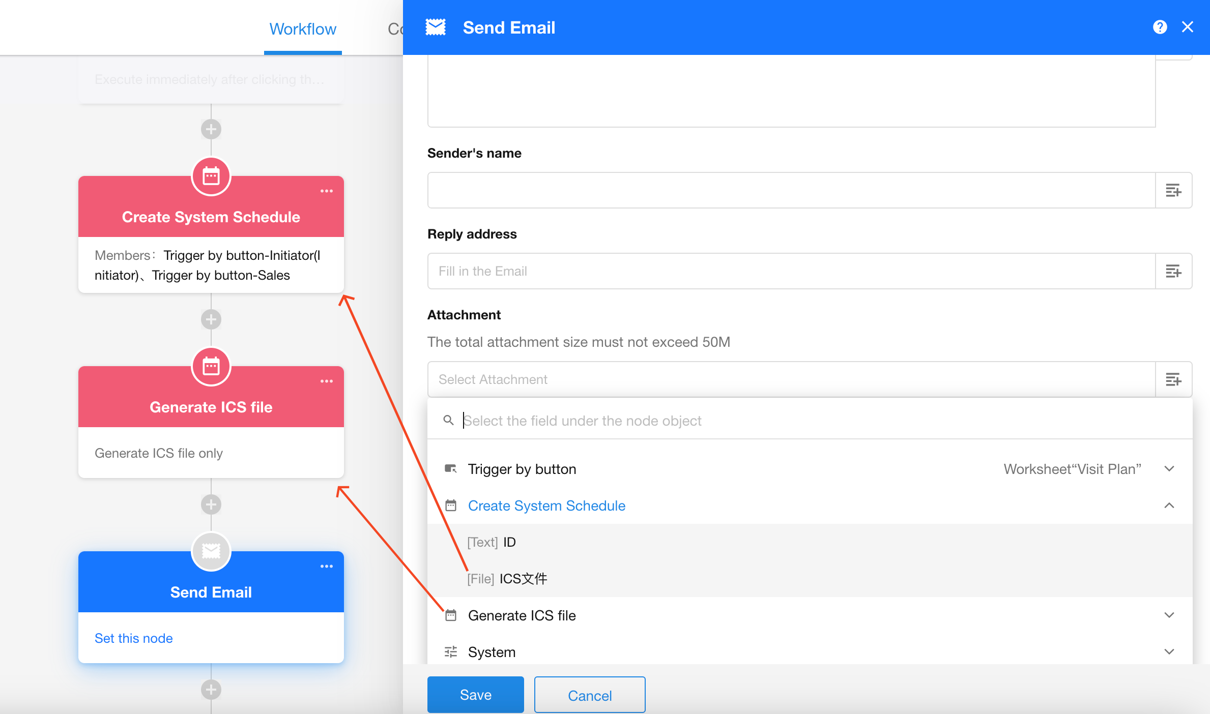 Create a system schedule and simultaneously generate an ICS file, which can be written into an attachment field in subsequent nodes.
