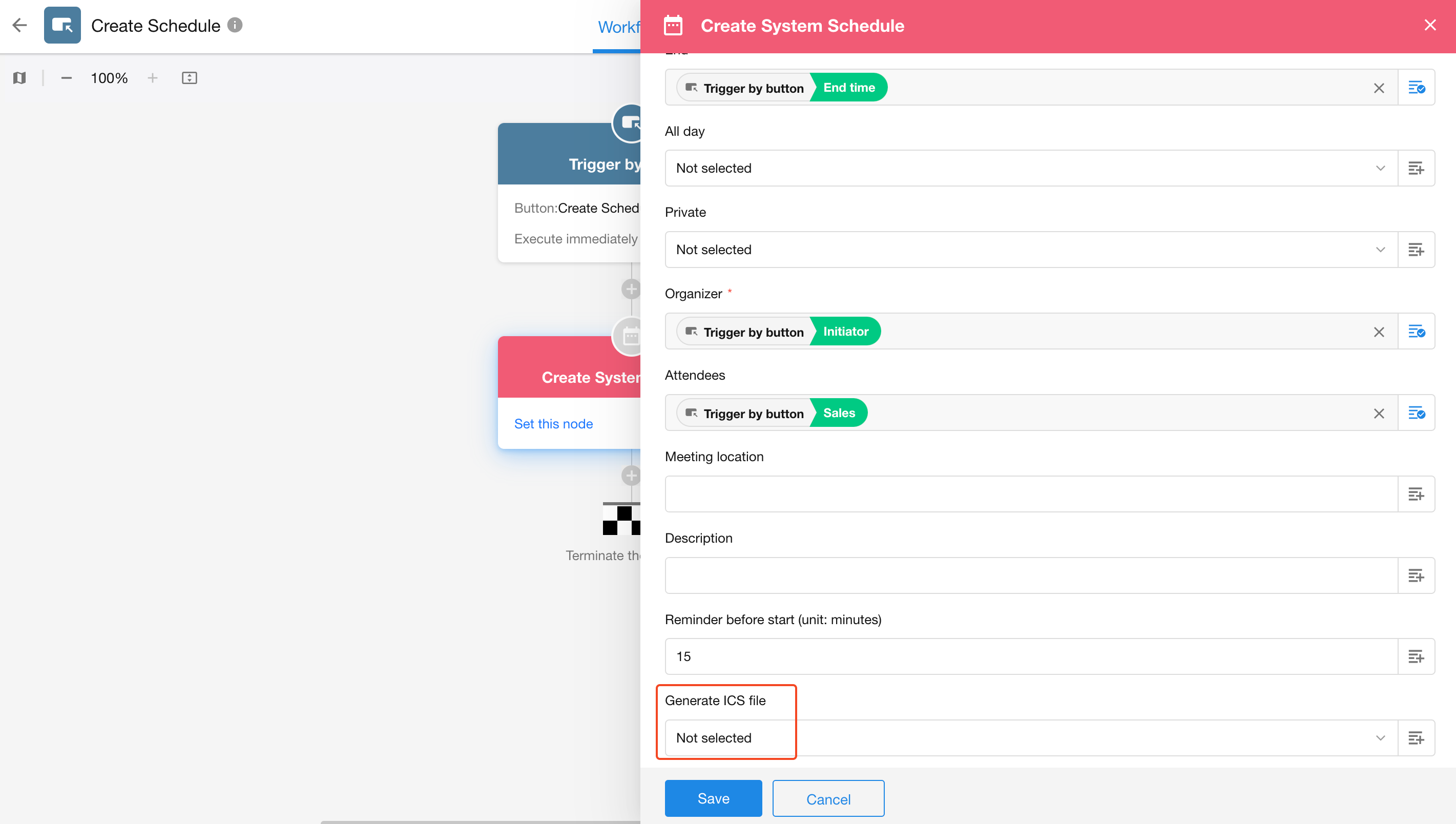 Node Function: Using data from a worksheet, the Create Event node can automatically create a schedule under the collaboration module or generate an ICS file to be sent as an email attachment. Clicking the file will add it to the recipient's personal calendar.