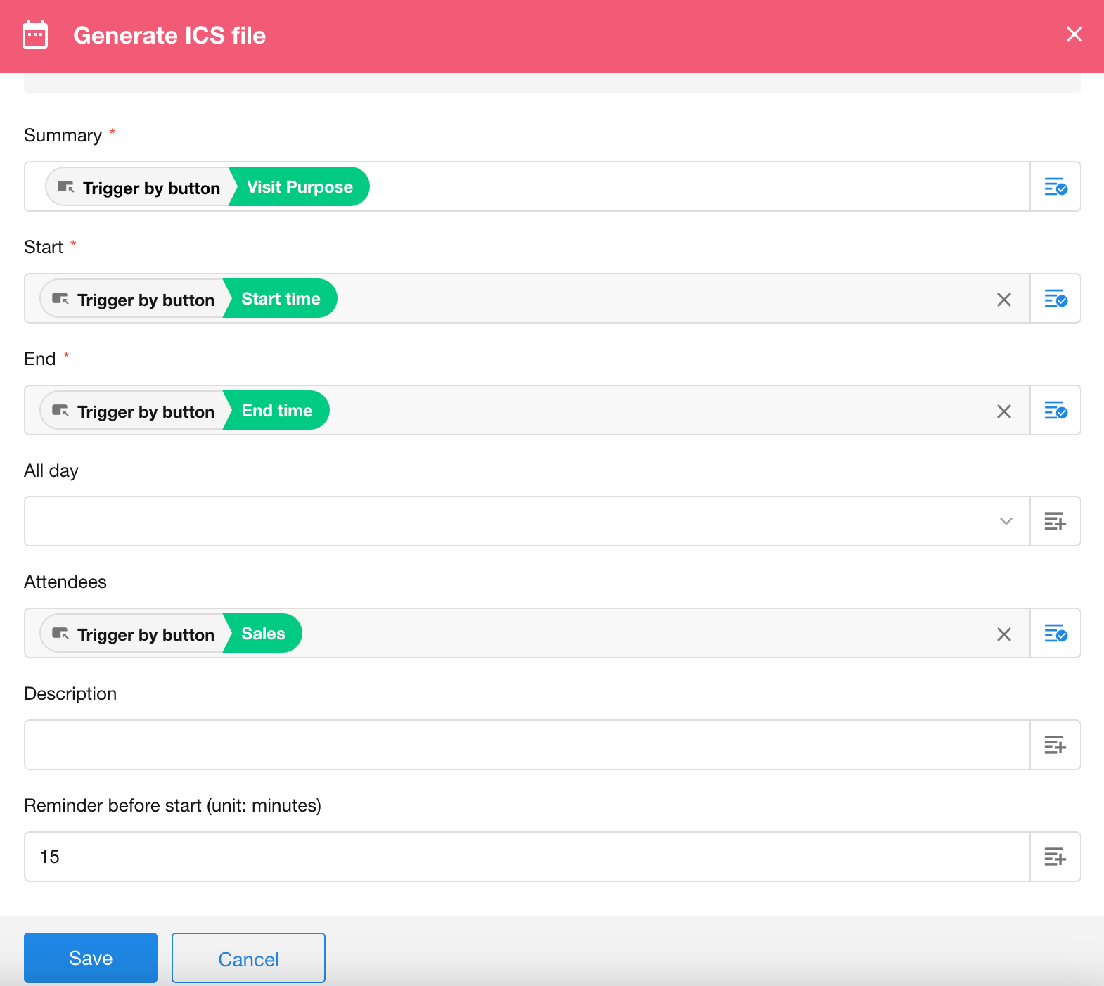 Generate ICS File: If selected, an ICS file will be automatically generated for use in subsequent nodes.