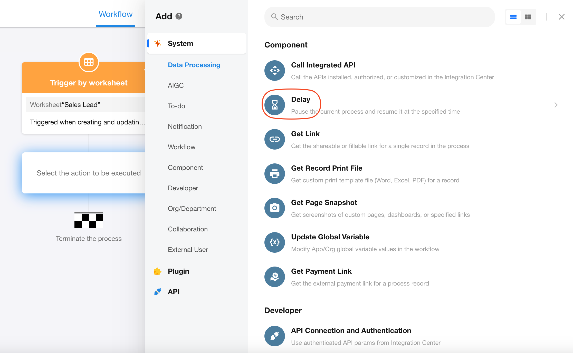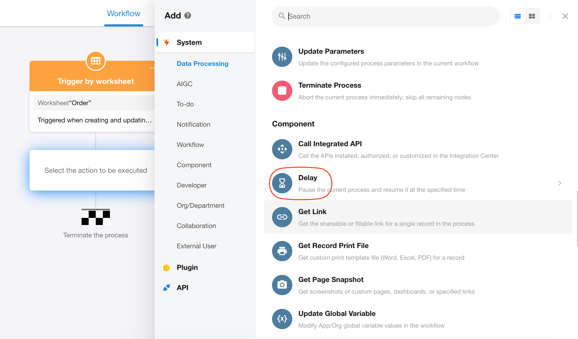 Example Configuration: When new order is created → Trigger workflow → Delay until 8:00 AM on "Shipment Date" → Then execute subsequent nodes