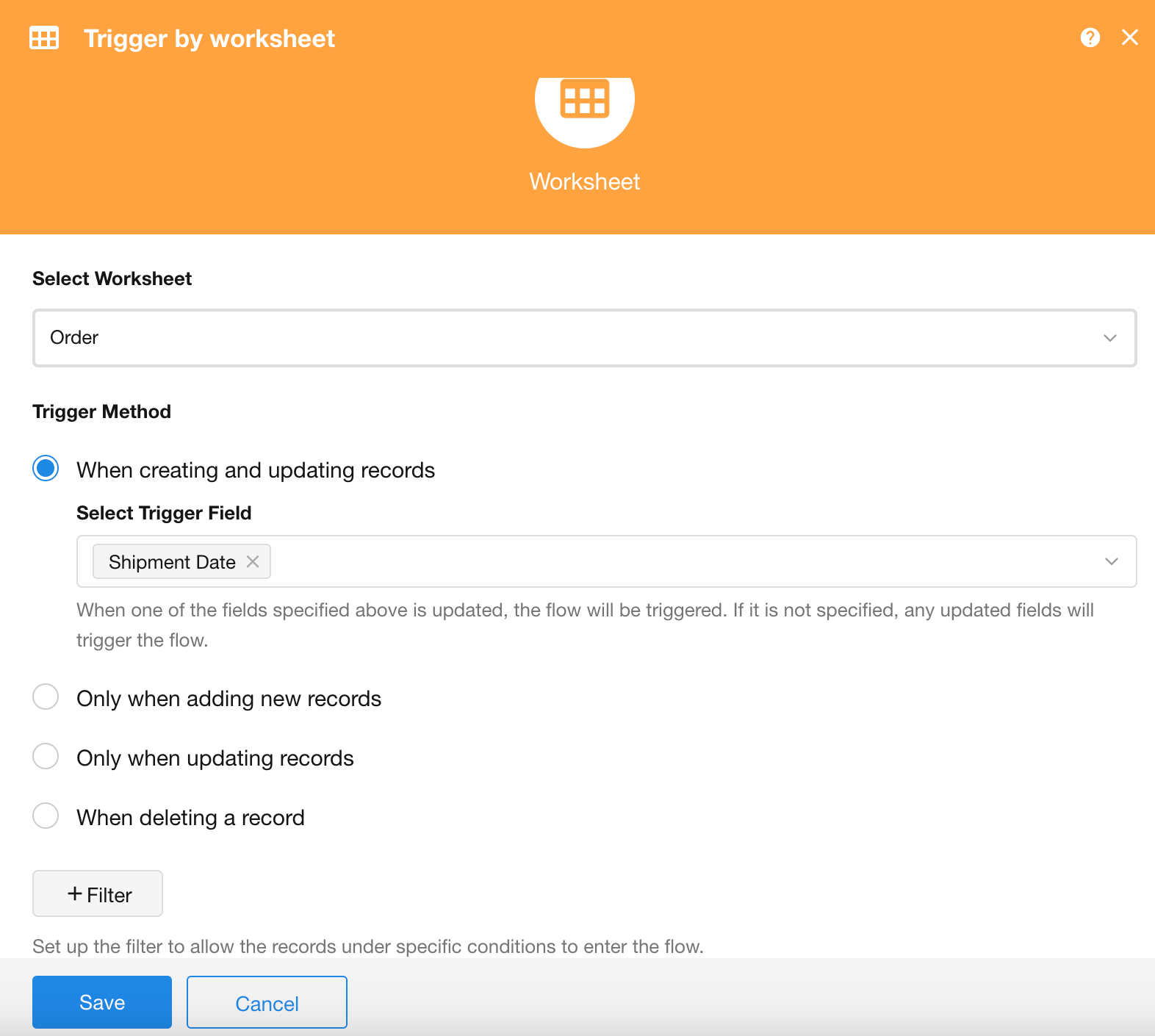 Each order in the order worksheet has an expected shipment date. Once the shipment date arrives, the workflow is triggered to notify the packing staff.