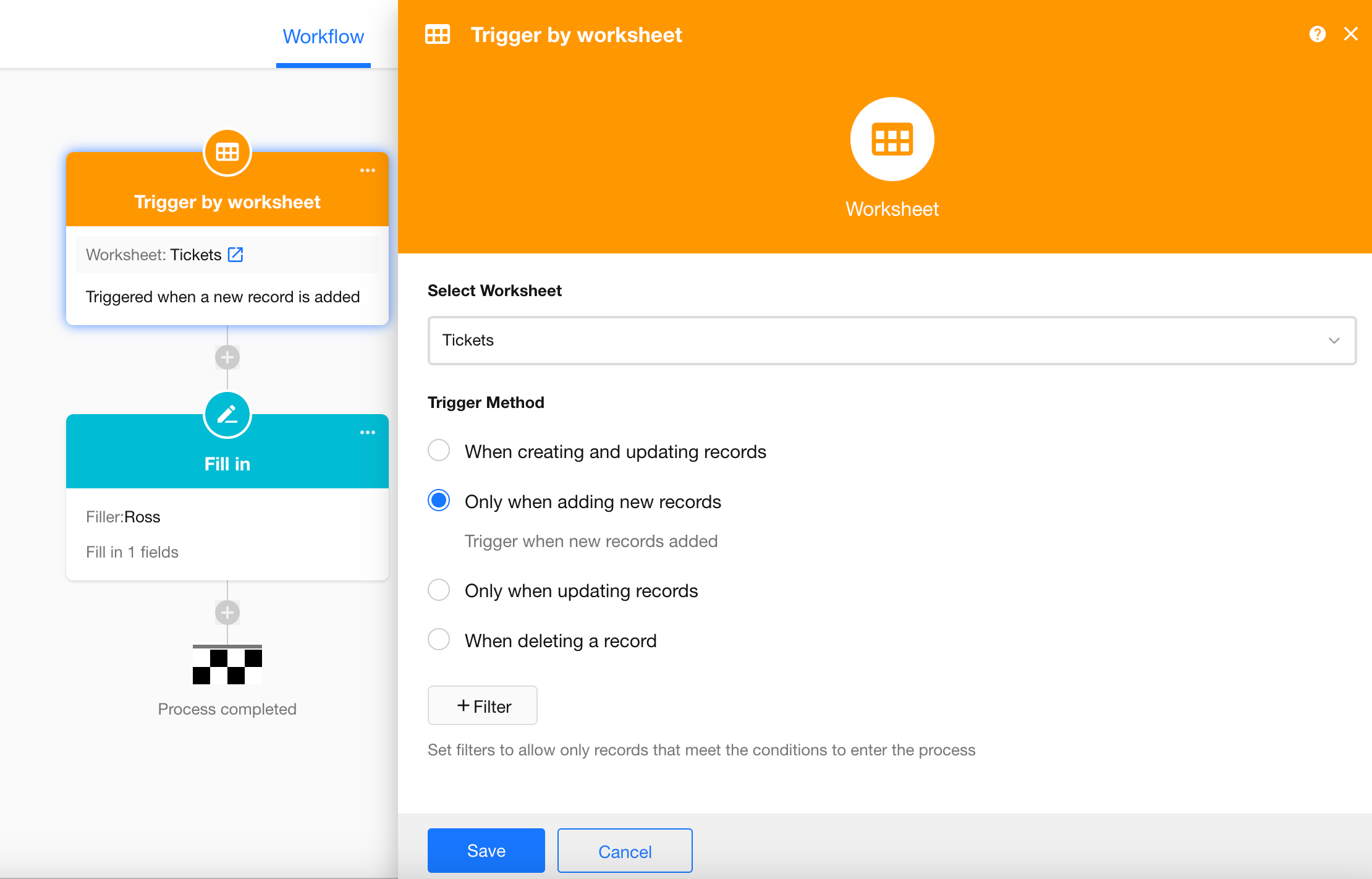 Otherwise, the workflow will remain in progress, and subsequent nodes will not be executed.Editing the record directly in the worksheet does not count as completing the fill-in task. The Fill-in node will still remain pending.