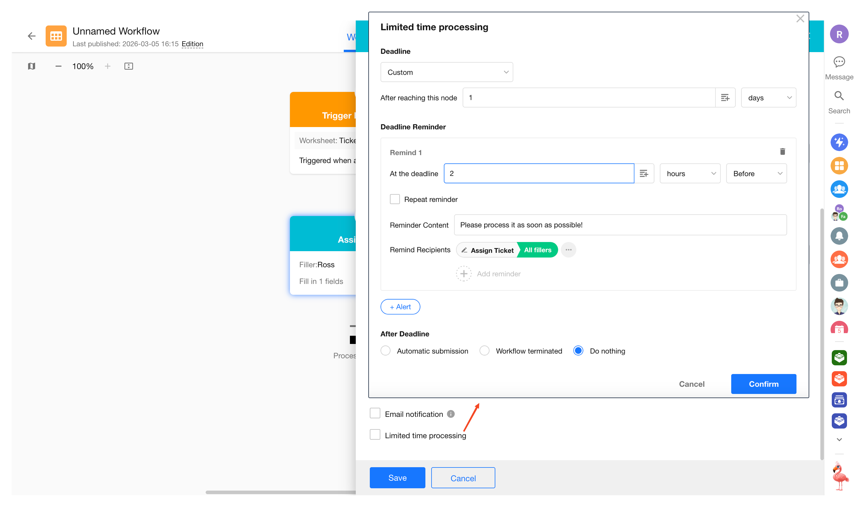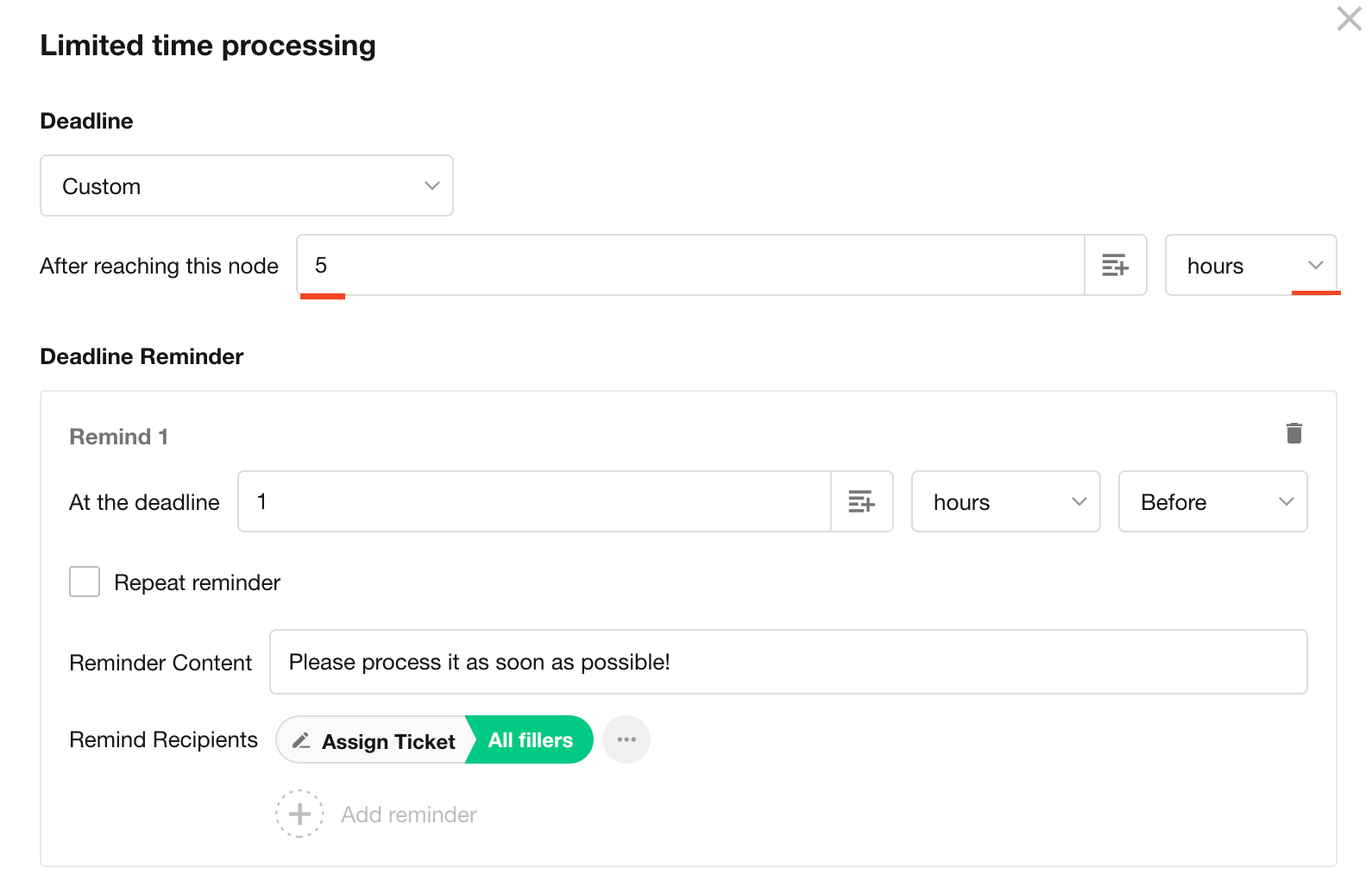 You can set a deadline for the fill-in user at this node. If the task is not completed before the deadline, it will be treated as overdue.