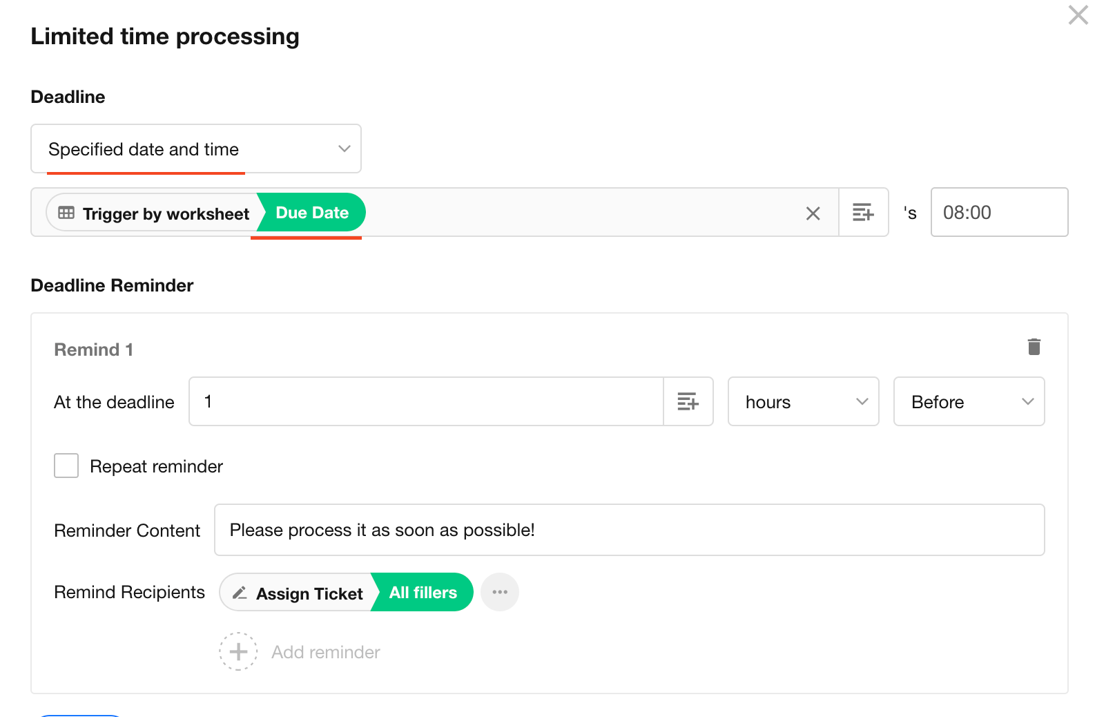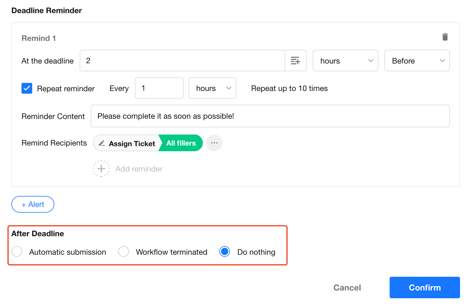You can configure automatic reminders before or after the deadline to prompt the fill-in user to complete the task.