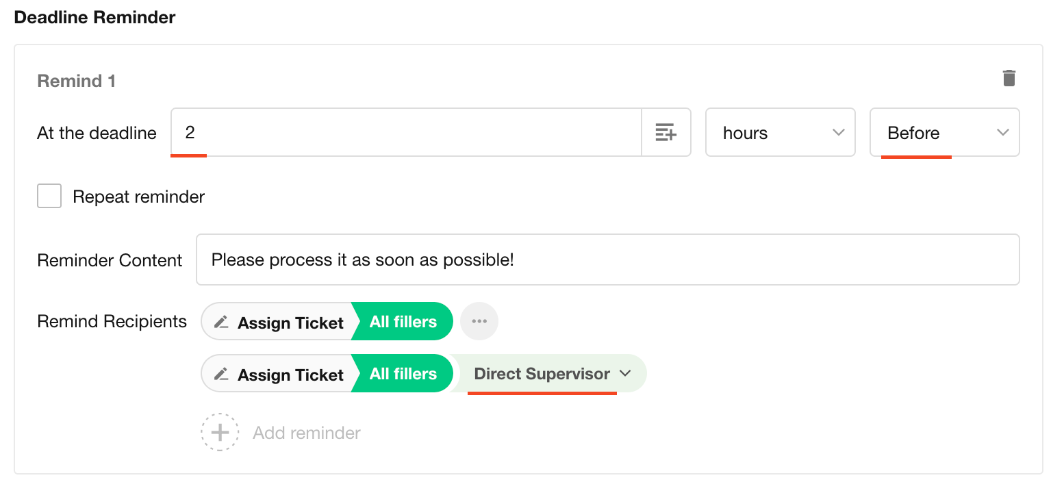 For example, as shown below, a reminder will be sent 2 hours before the deadline to both the fill-in user and their supervisor.