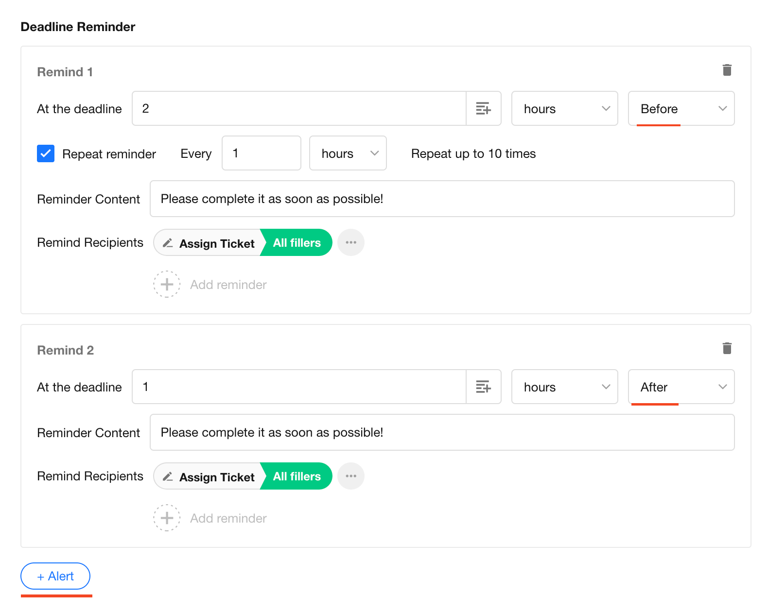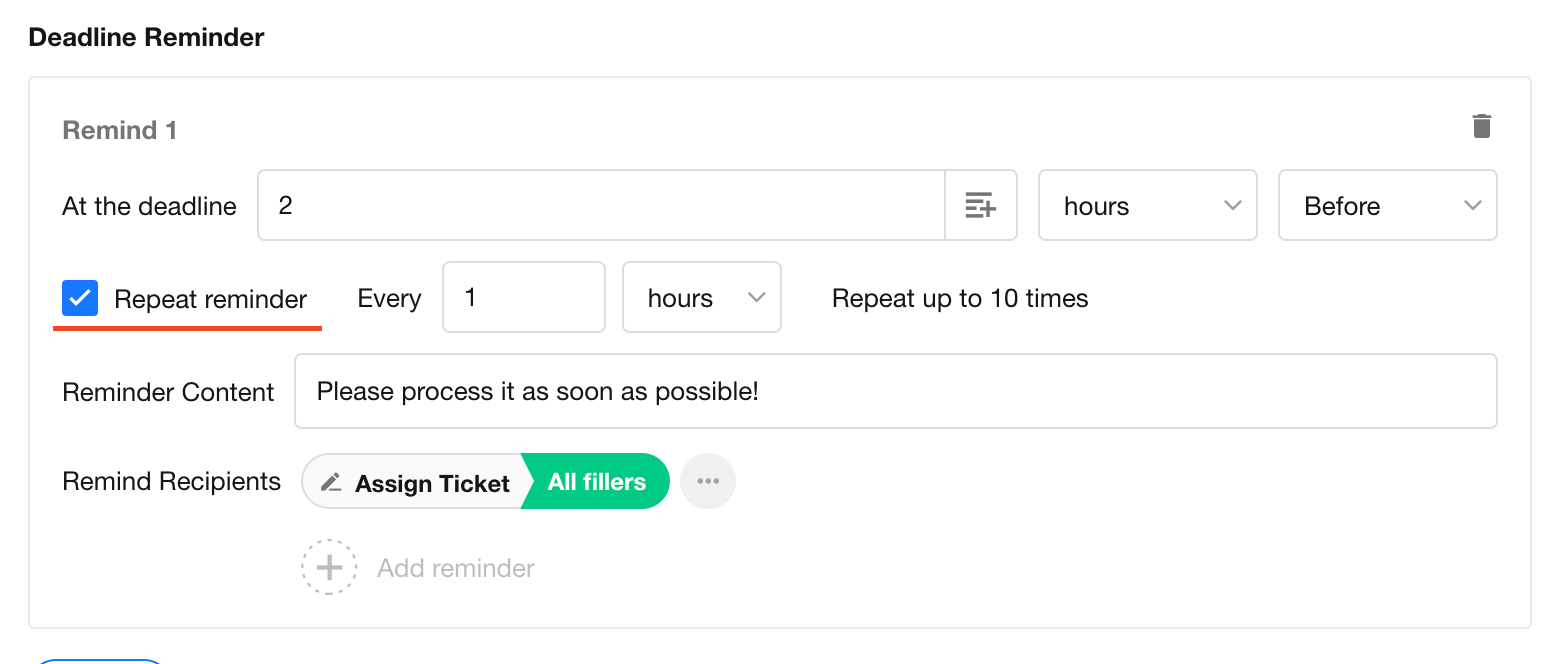 If Repeat Reminder is enabled, the system will send reminders repeatedly at the specified interval after the first reminder (even after the deadline).