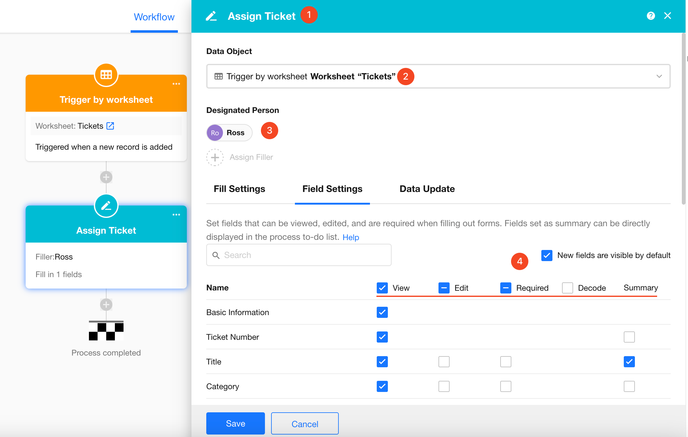 - If enabled, any new fields added to the worksheet later will automatically have the View permission selected.