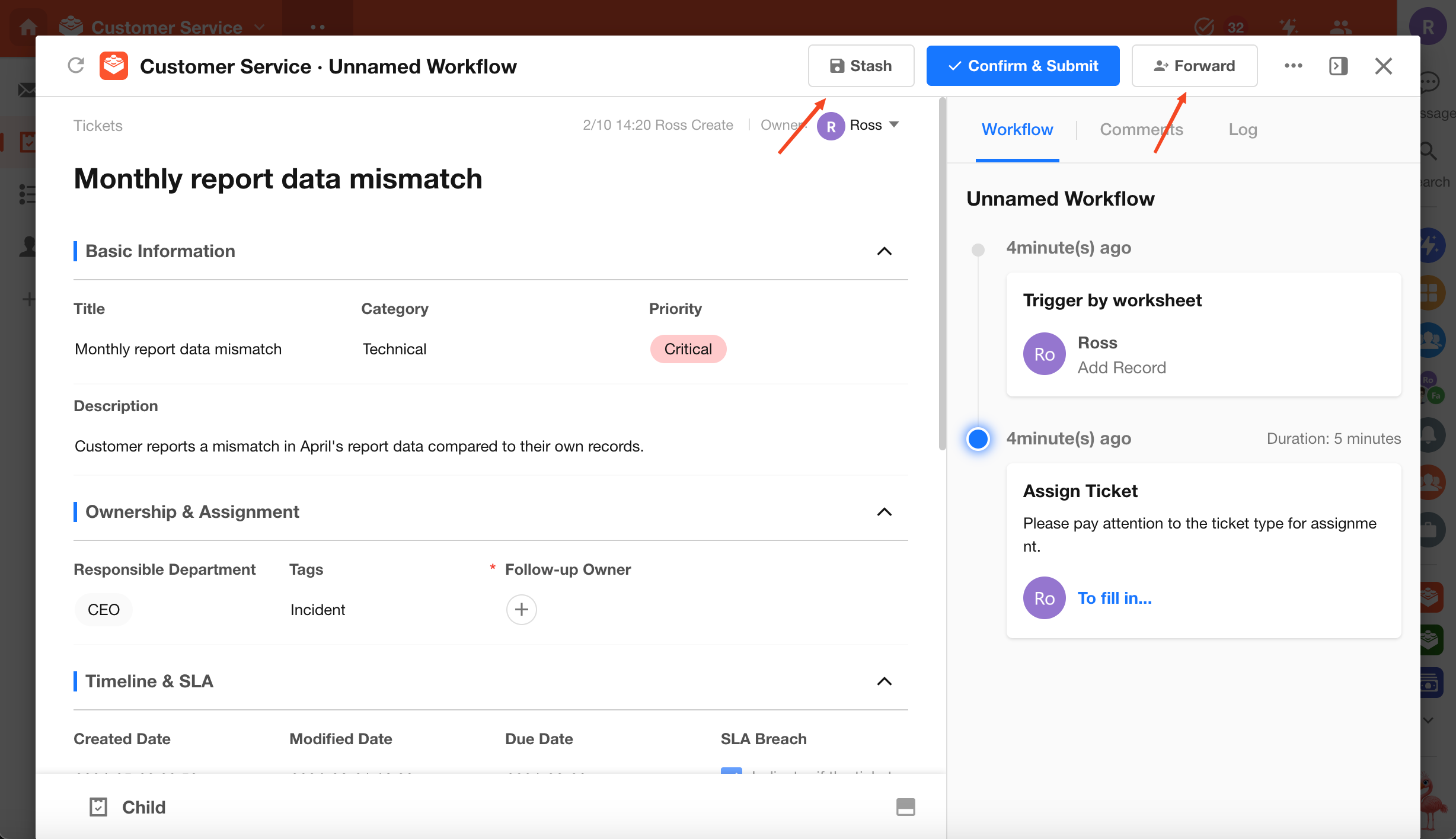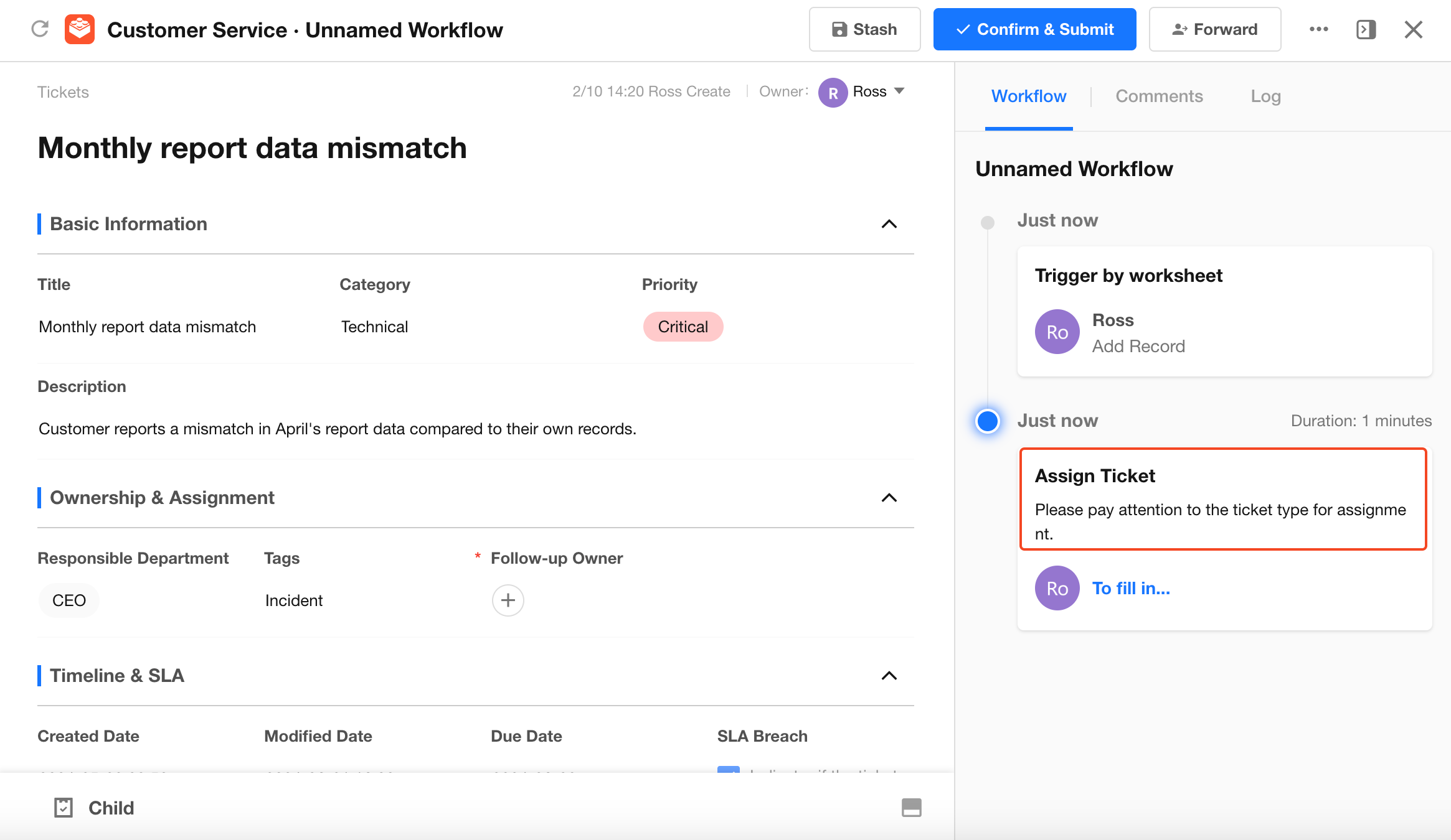For example, customer service staff first perform a preliminary review of a new ticket and need to assign a follow-up technician. Therefore, the Follow-up Owner field should be set as required, while other fields can be configured as hidden, read-only, optional, or required as needed.