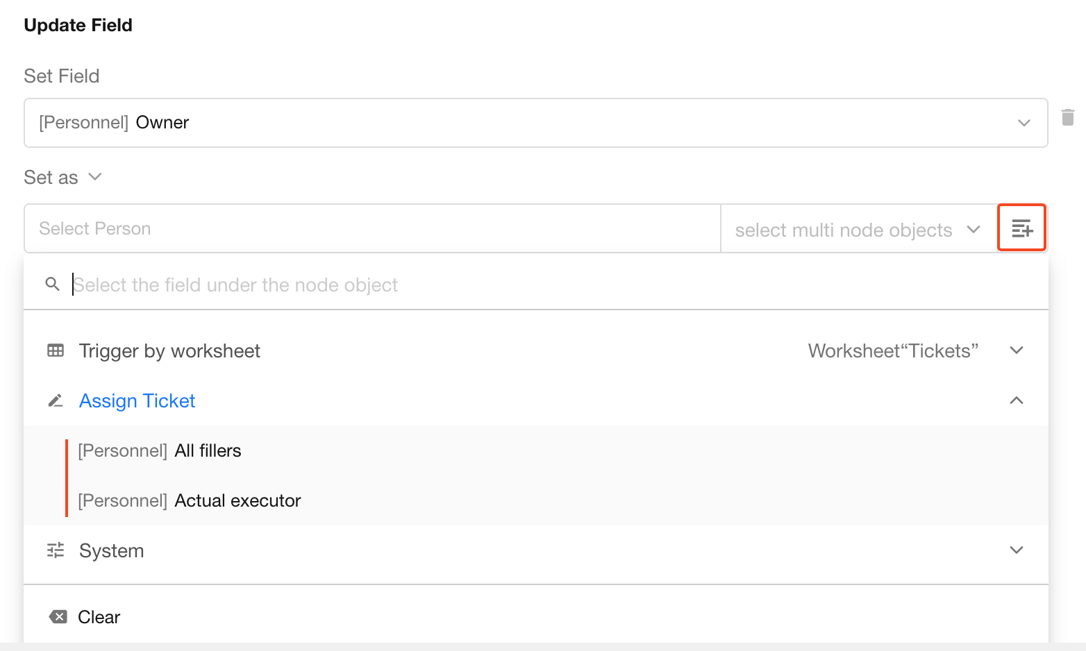 You can automatically update field values in the record when the workflow enters the Fill-in node and when the fill-in user completes the task and leaves the node.