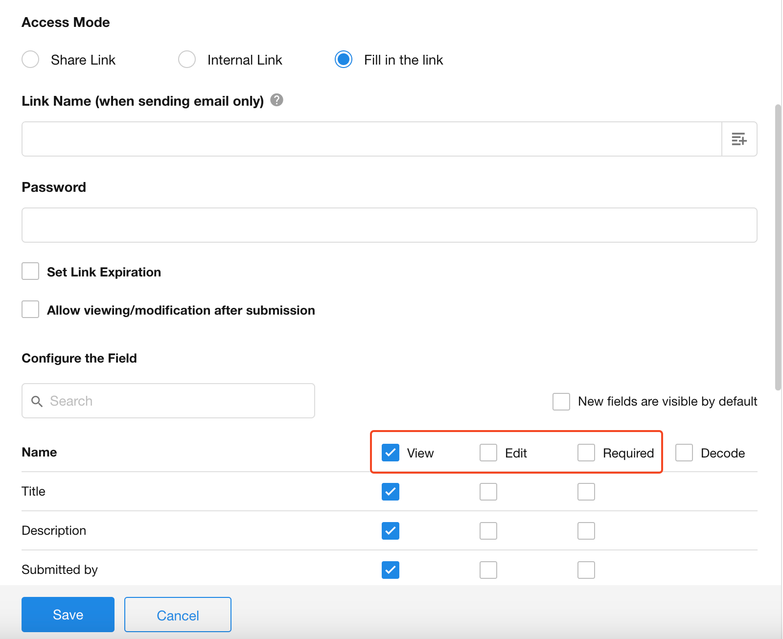 For Editable Links, configure view/edit/required settings: