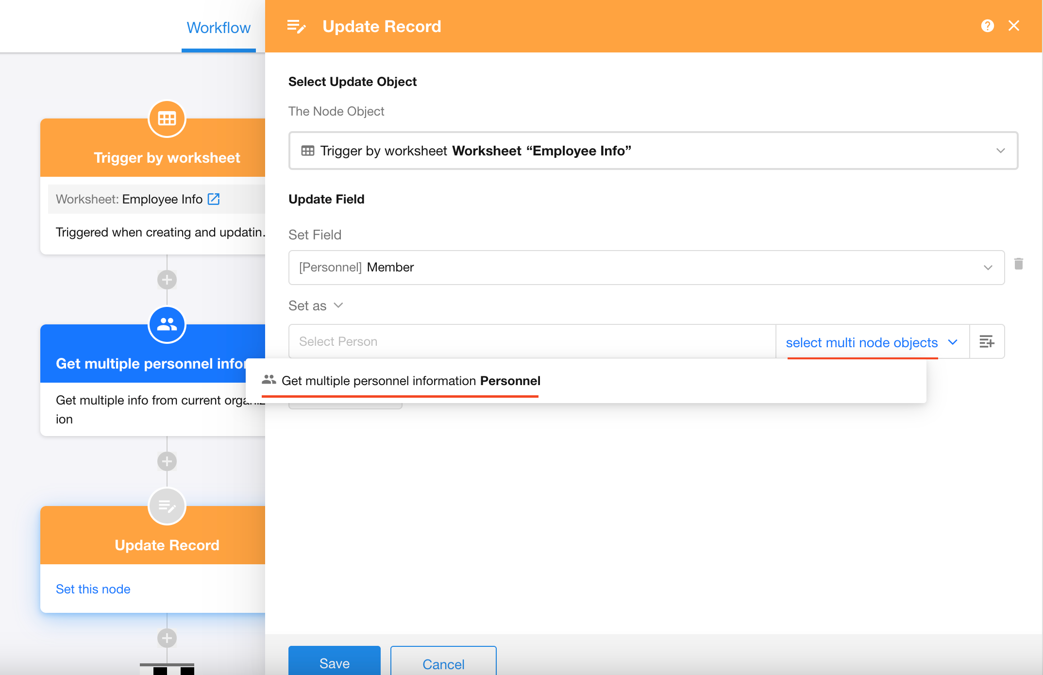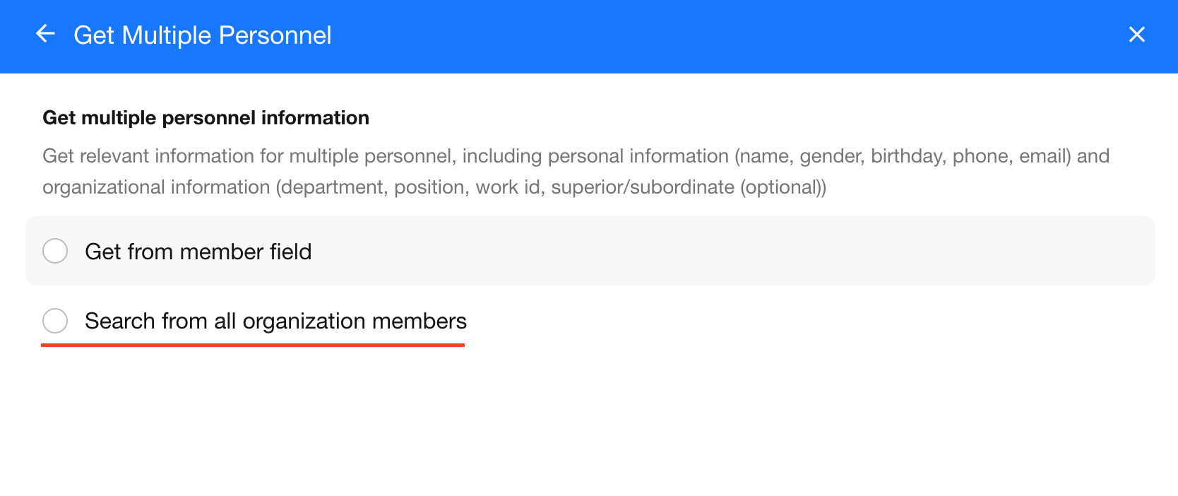 2. Add a “Get Multiple Personnel” node and choose to retrieve data from organization members