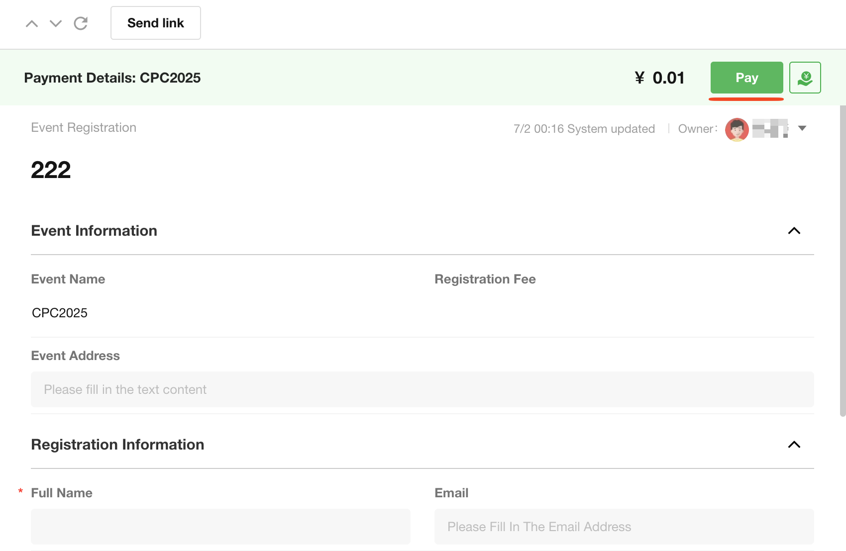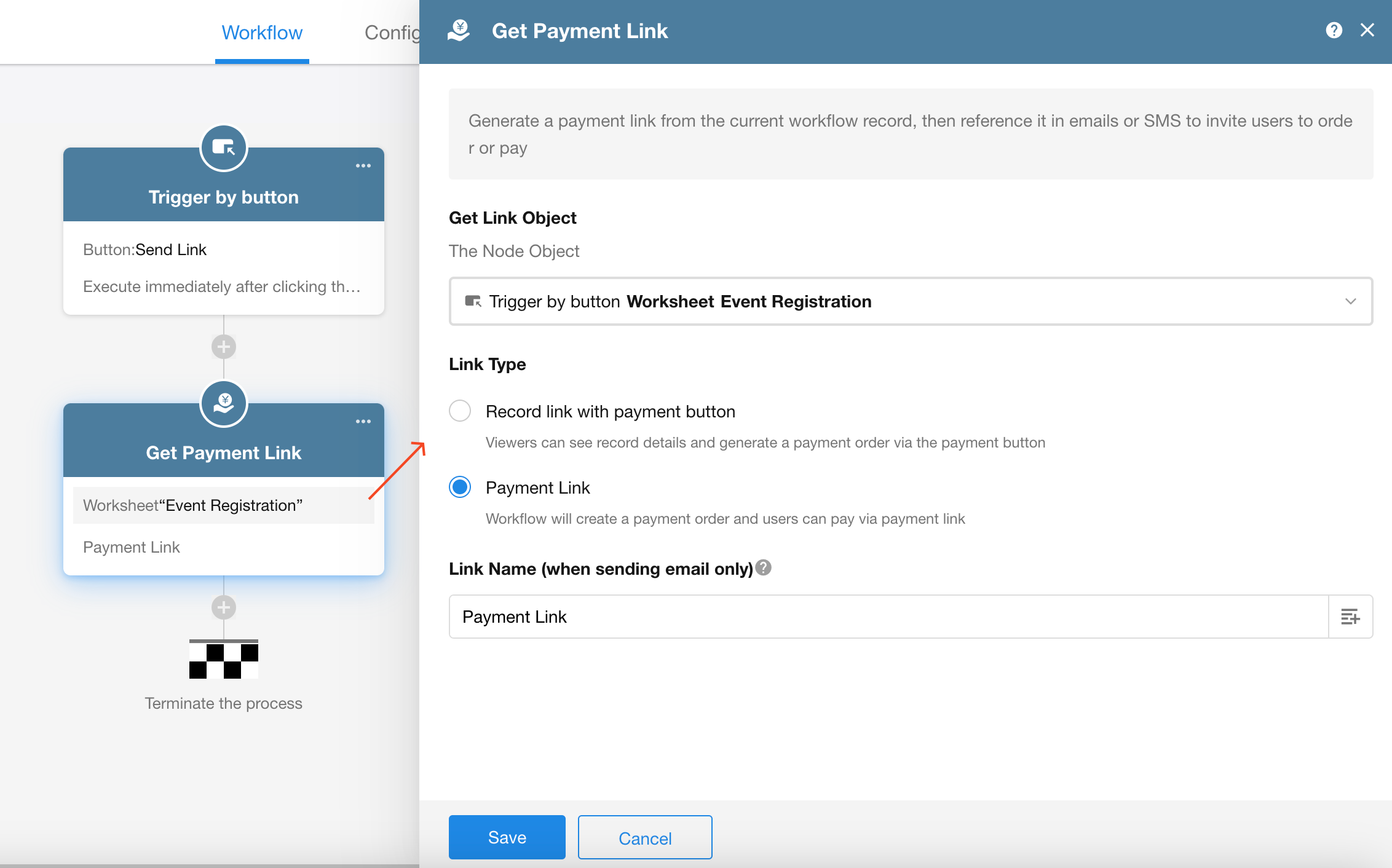 Use Case: After registering a customer's event registration information, trigger a workflow and send a payment link to the customer via SMS or email to complete payment.