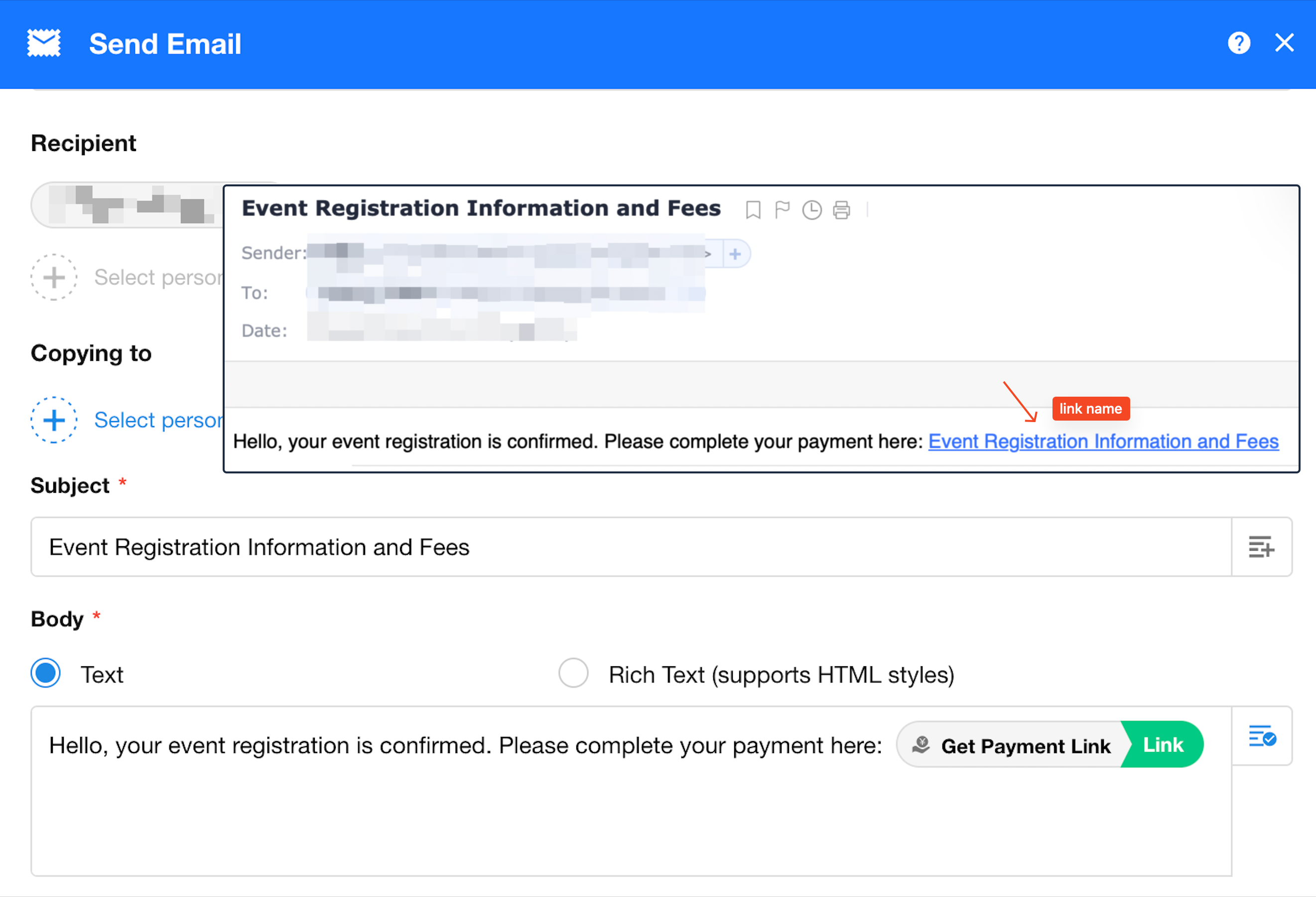 For example, if you set the payment link name as "Event Registration Information and Fees" and select this link in the "Send Email" node:
