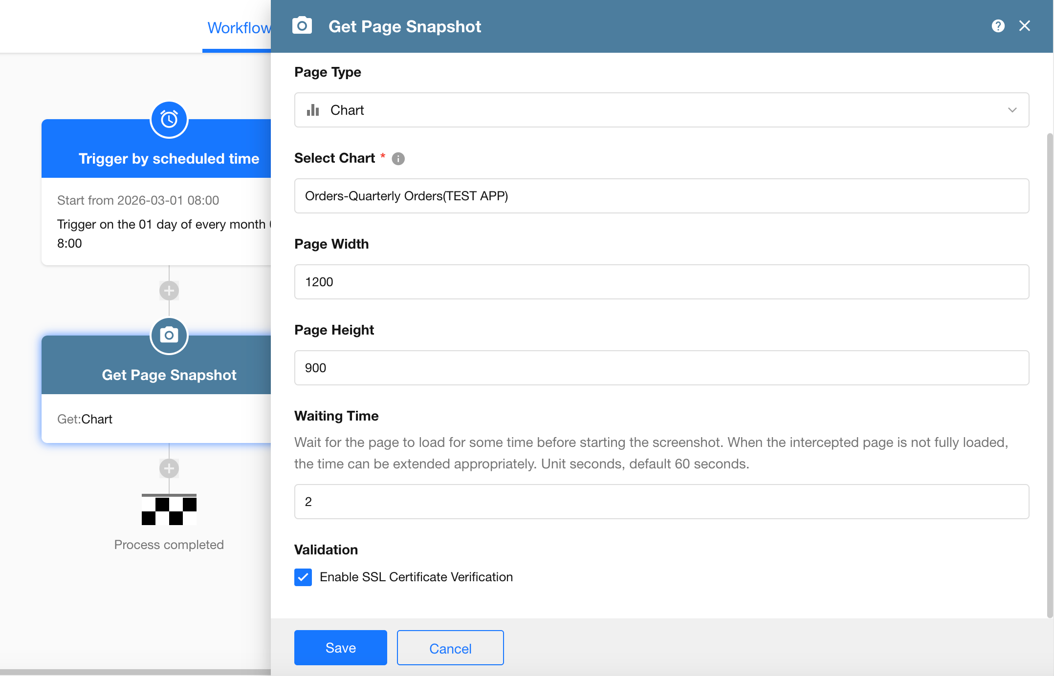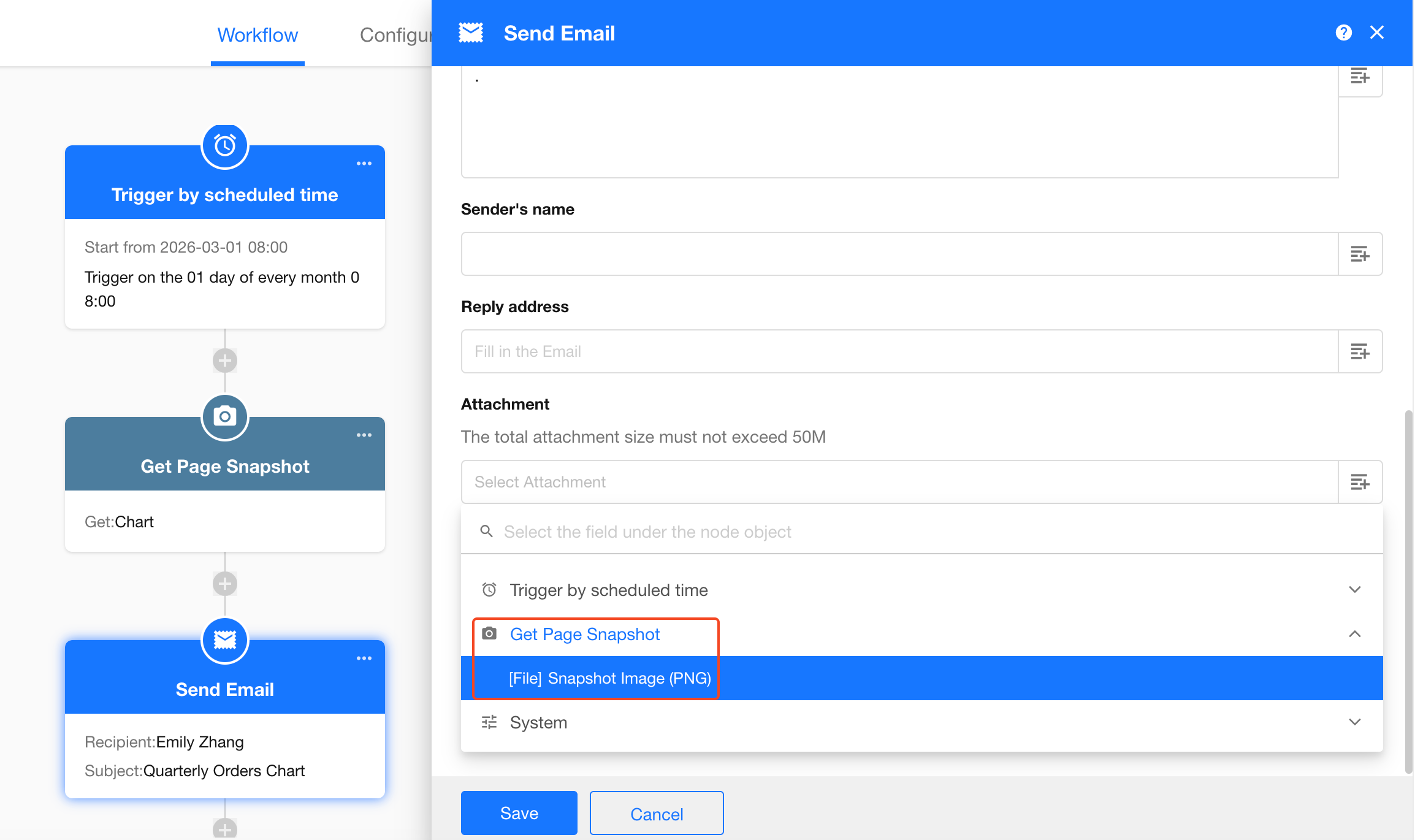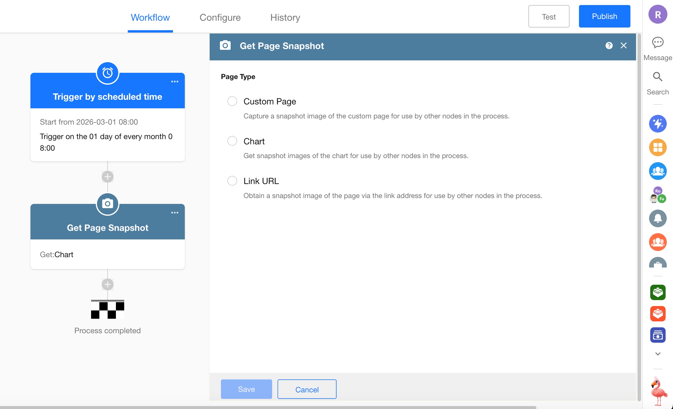 The Get Page Snapshot node allows users to capture a snapshot image of a custom page, chart, or URL. The generated image can be saved to an attachment field or sent as an email attachment.