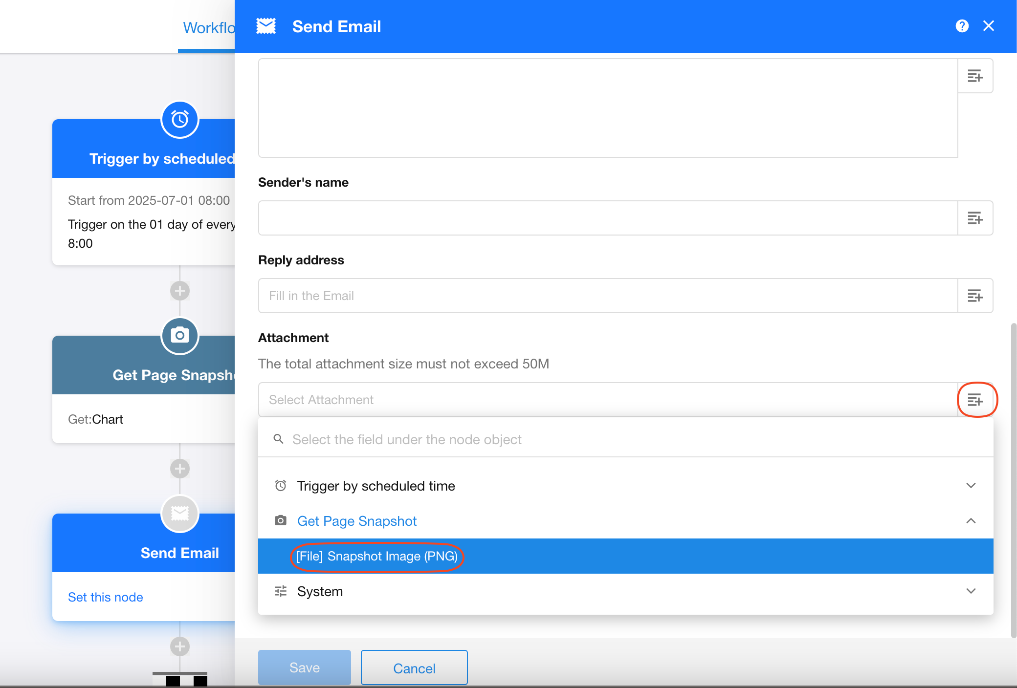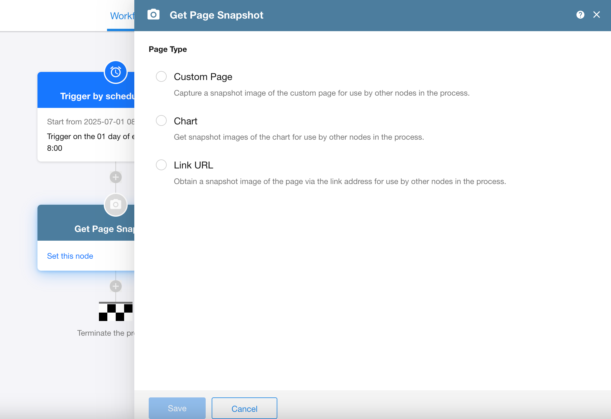 The "Get Page Snapshot" node captures snapshots of custom pages, charts, or web addresses, which can then be written to file fields or sent as email attachments. This feature is only available in paid editions.